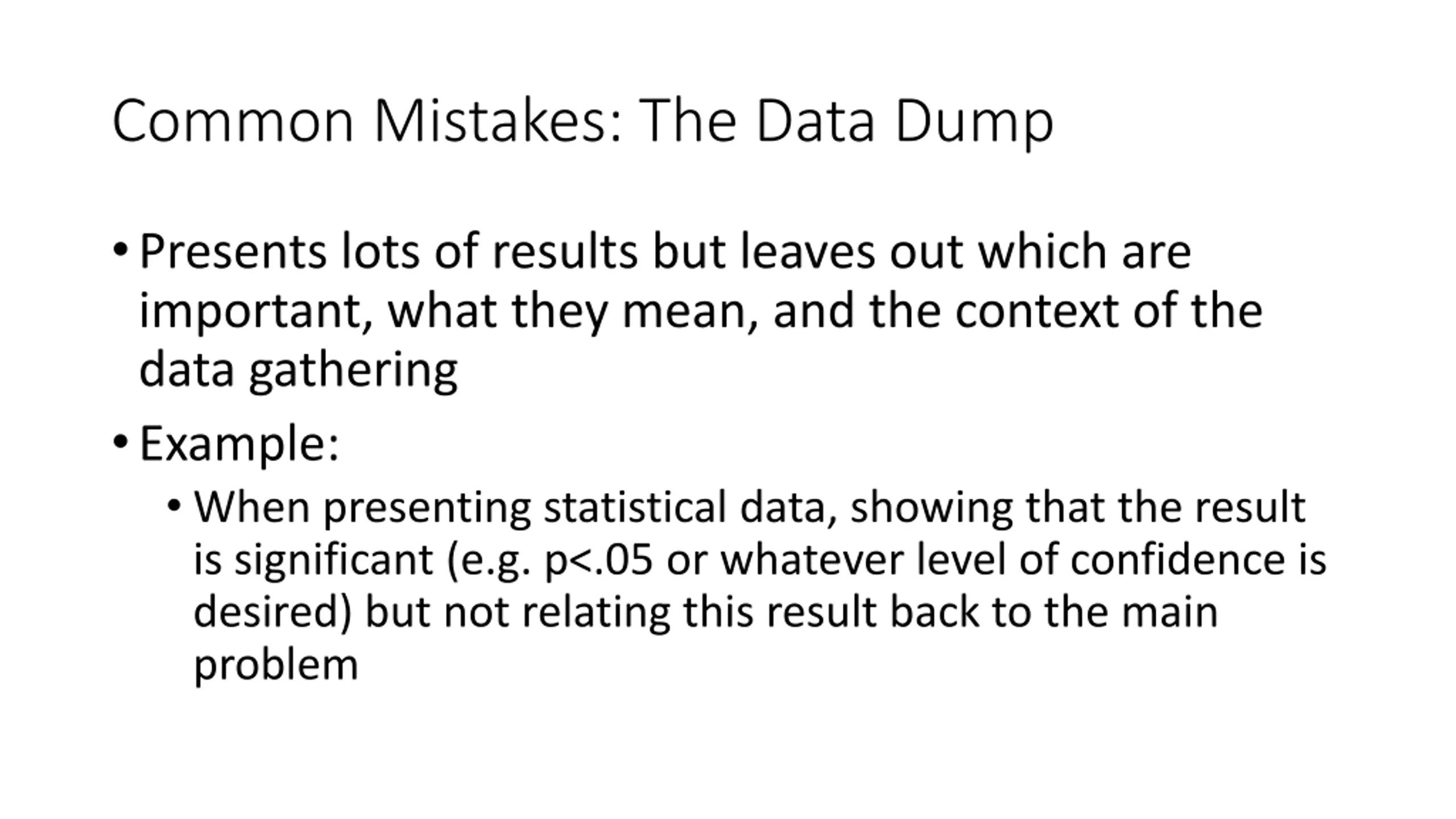 Common Mistakes: The Data Dump Presents lots of results but leaves out which are important, what they mean, and the context of the data gathering Example: When presenting statistical data, showing that the result is significant (e.g. p<.05 or whatever level of confidence is desired) but not relating this result back to the main problem