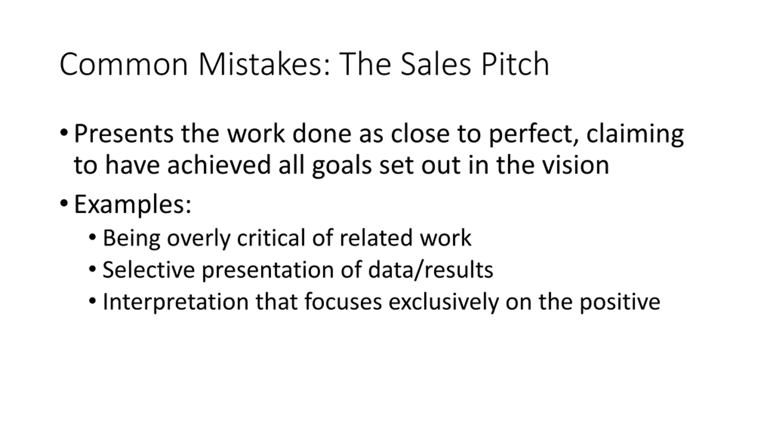 Common Mistakes: The Sales Pitch Presents the work done as close to perfect, claiming to have achieved all goals set out in the vision Examples: Being overly critical of related work Selective presentation of data/results Interpretation that focuses exclusively on the positive