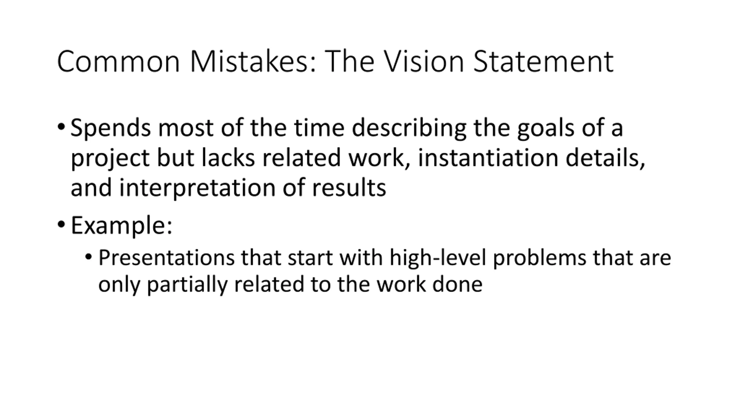 Common Mistakes: The Vision Statement Spends most of the time describing the goals of a project but lacks related work, instantiation details, and interpretation of results Example: Presentations that start with high-level problems that are only partially related to the work done