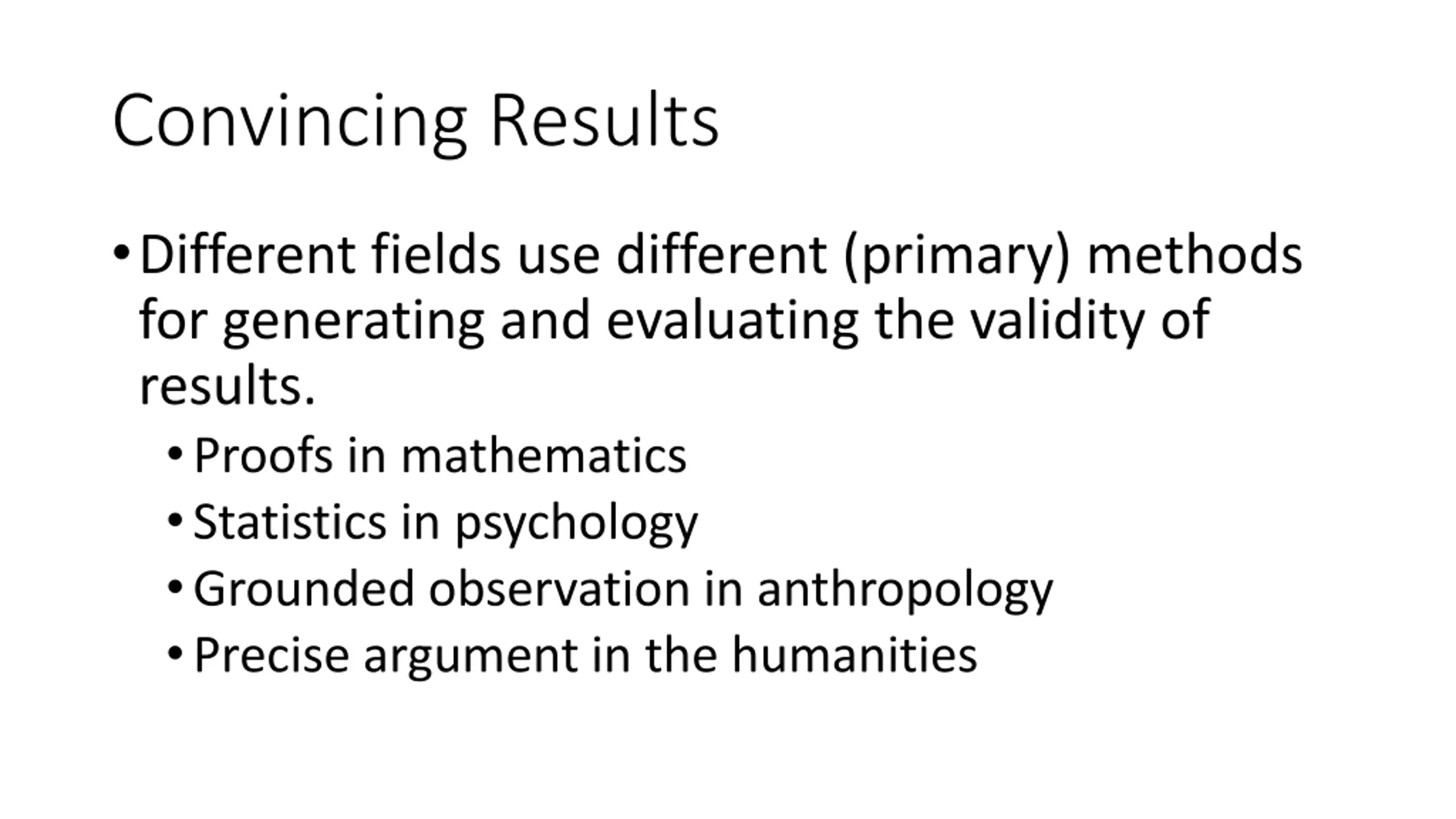 Convincing Results Different fields use different (primary) methods for generating and evaluating the validity of results. Proofs in mathematics Statistics in psychology Grounded observation in anthropology Precise argument in the humanities