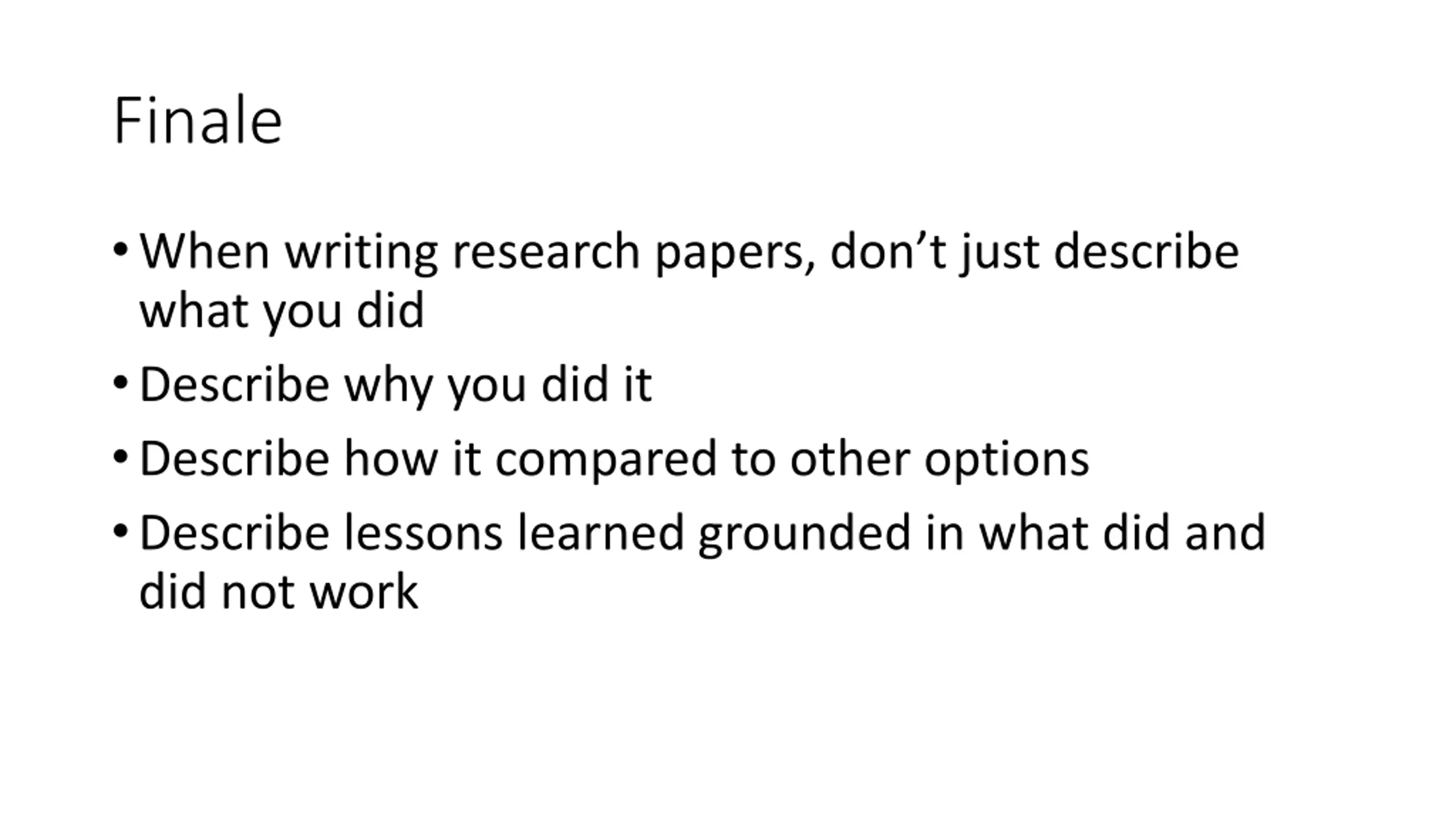 Finale When writing research papers, don t just describe what you did Describe why you did it Describe how it compared to other options Describe lessons learned grounded in what did and did not work