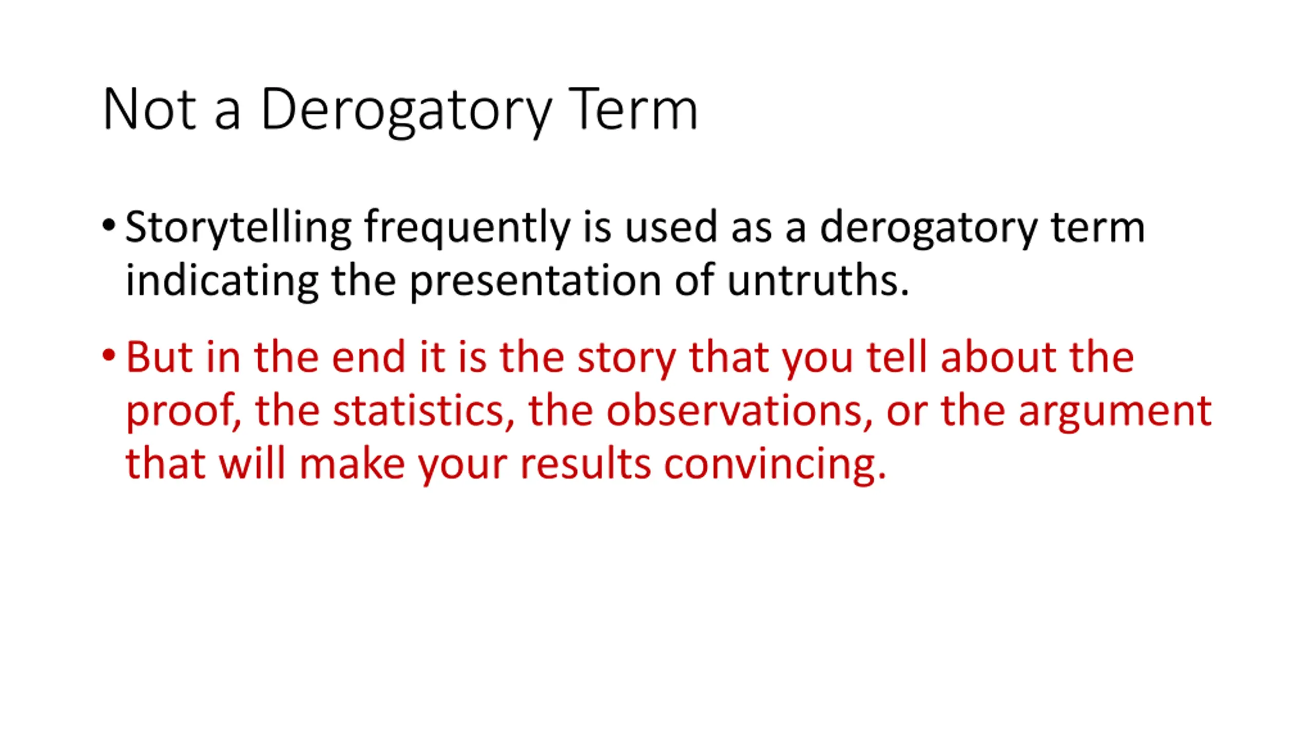 Not a Derogatory Term Storytelling frequently is used as a derogatory term indicating the presentation of untruths. But in the end it is the story that you tell about the proof, the statistics, the observations, or the argument that will make your results convincing.