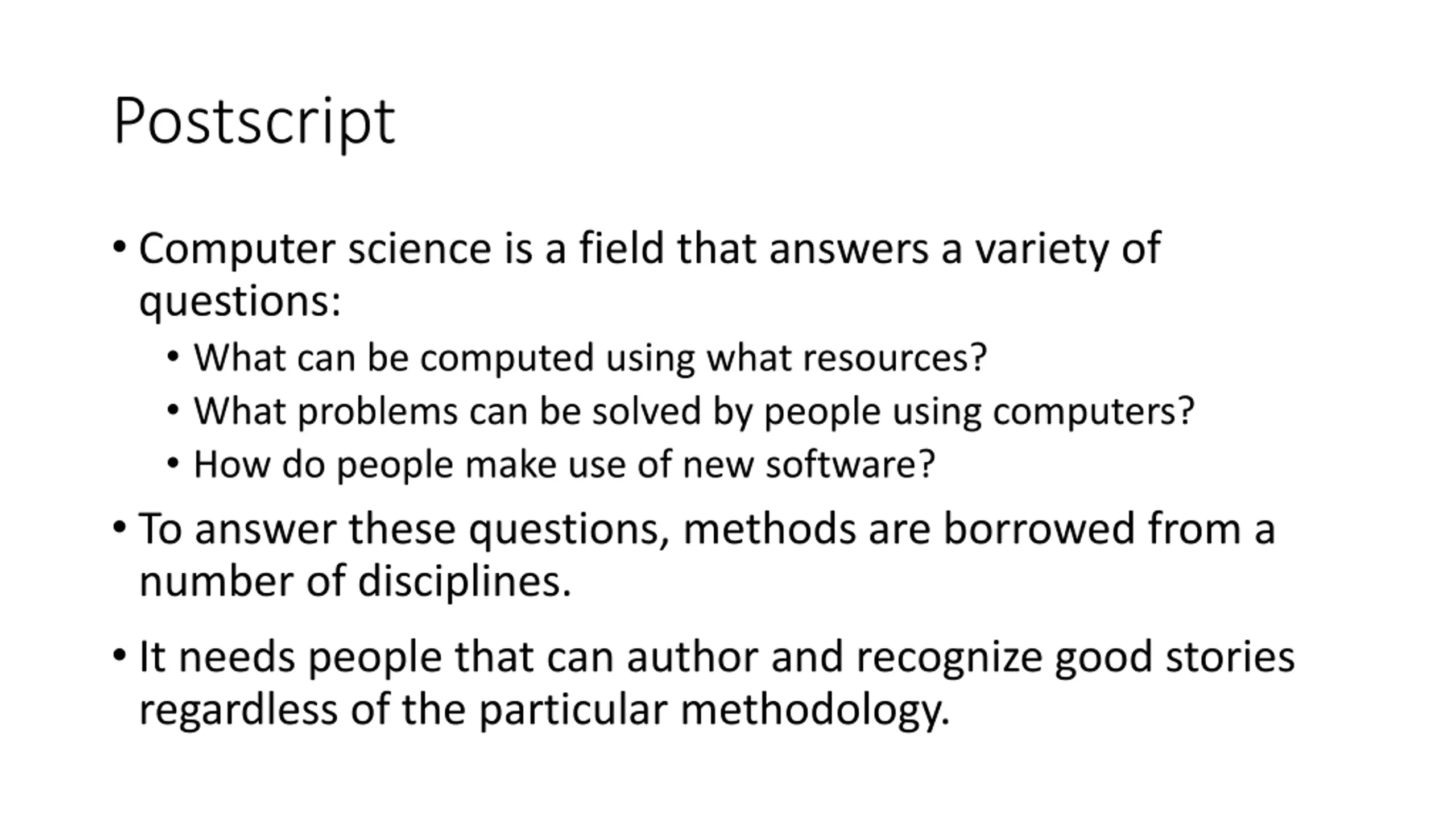 Postscript Computer science is a field that answers a variety of questions: What can be computed using what resources? What problems can be solved by people using computers? How do people make use of new software? To answer these questions, methods are borrowed from a number of disciplines. It needs people that can author and recognize good stories regardless of the particular methodology.