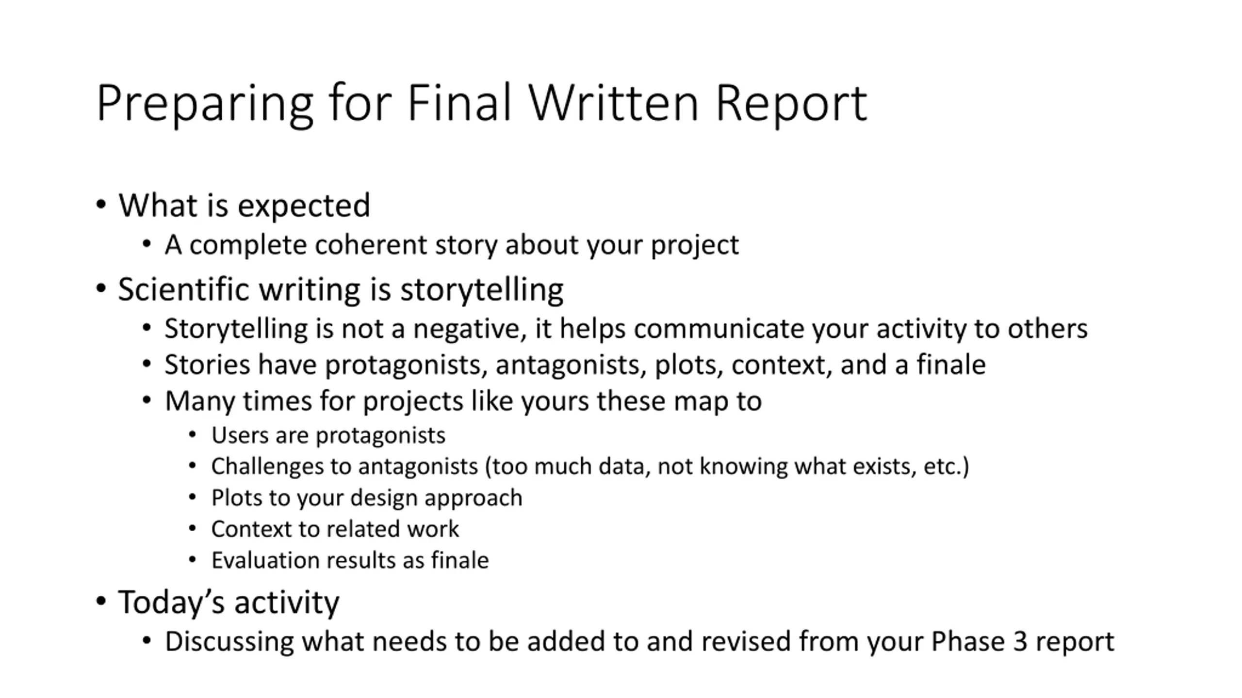 Preparing for Final Written Report What is expected A complete coherent story about your project Scientific writing is storytelling Storytelling is not a negative, it helps communicate your activity to others Stories have protagonists, antagonists, plots, context, and a finale Many times for projects like yours these map to Users are protagonists Challenges to antagonists (too much data, not knowing what exists, etc.) Plots to your design approach Context to related work Evaluation results as finale Today s activity Discussing what needs to be added to and revised from your Phase 3 report