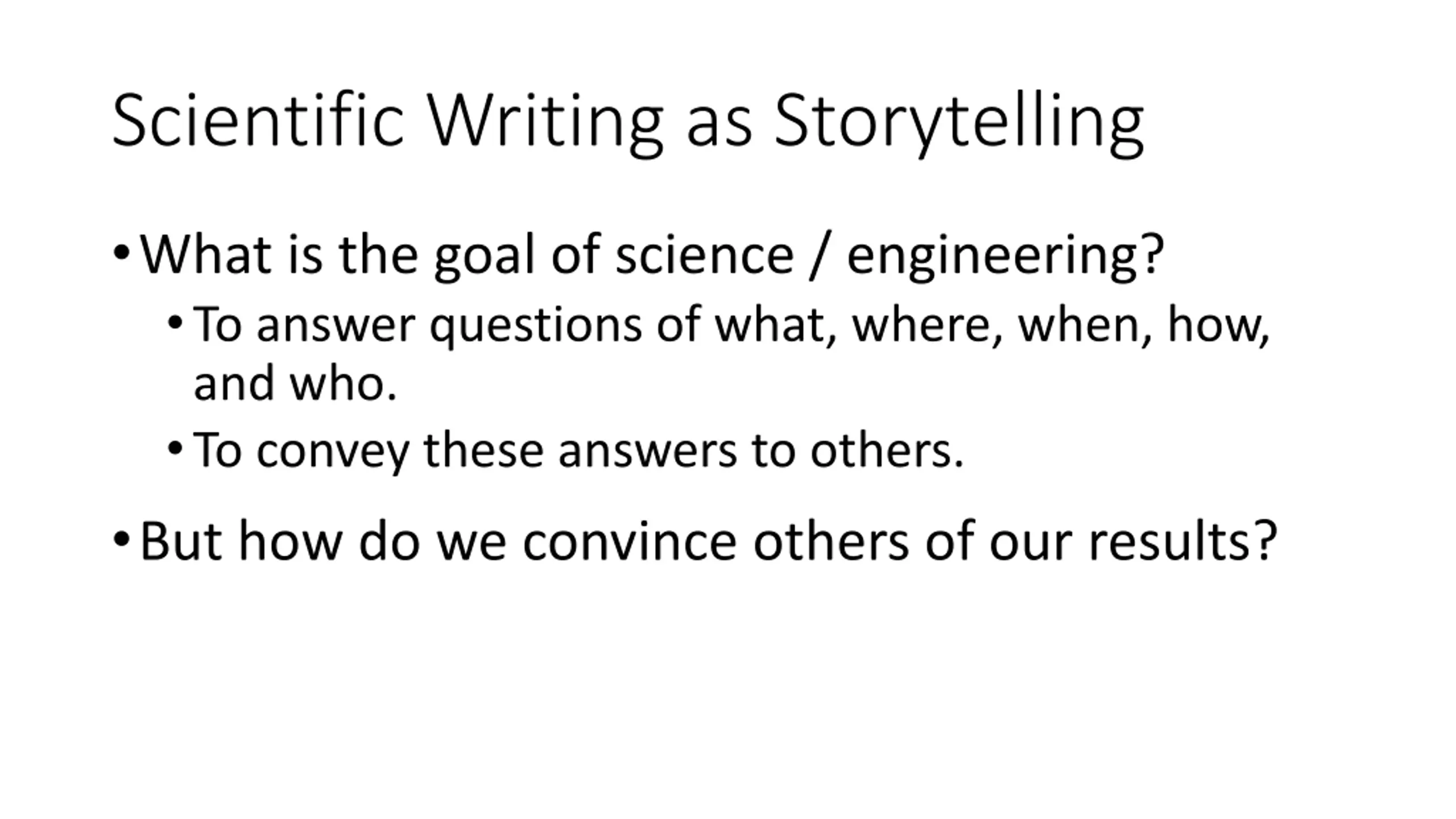 Scientific Writing as Storytelling What is the goal of science / engineering? To answer questions of what, where, when, how, and who. To convey these answers to others. But how do we convince others of our results?