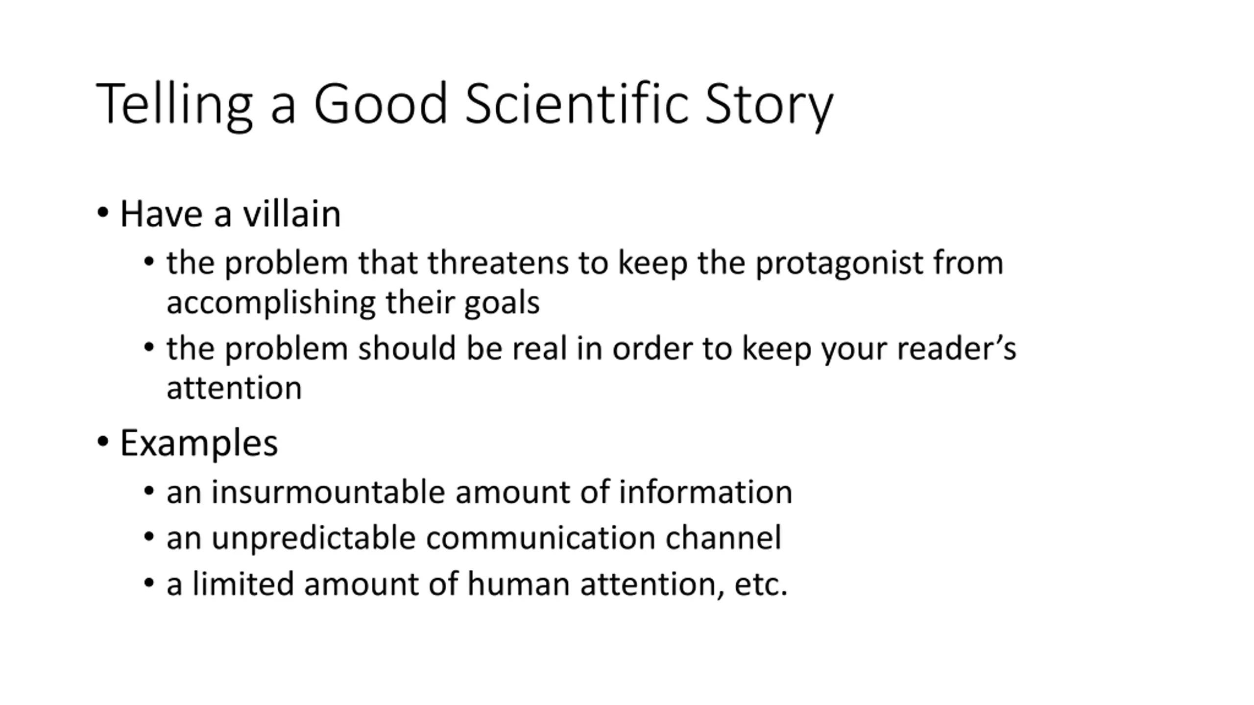 Telling a Good Scientific Story Have a villain the problem that threatens to keep the protagonist from accomplishing their goals the problem should be real in order to keep your reader s attention Examples an insurmountable amount of information an unpredictable communication channel a limited amount of human attention, etc.