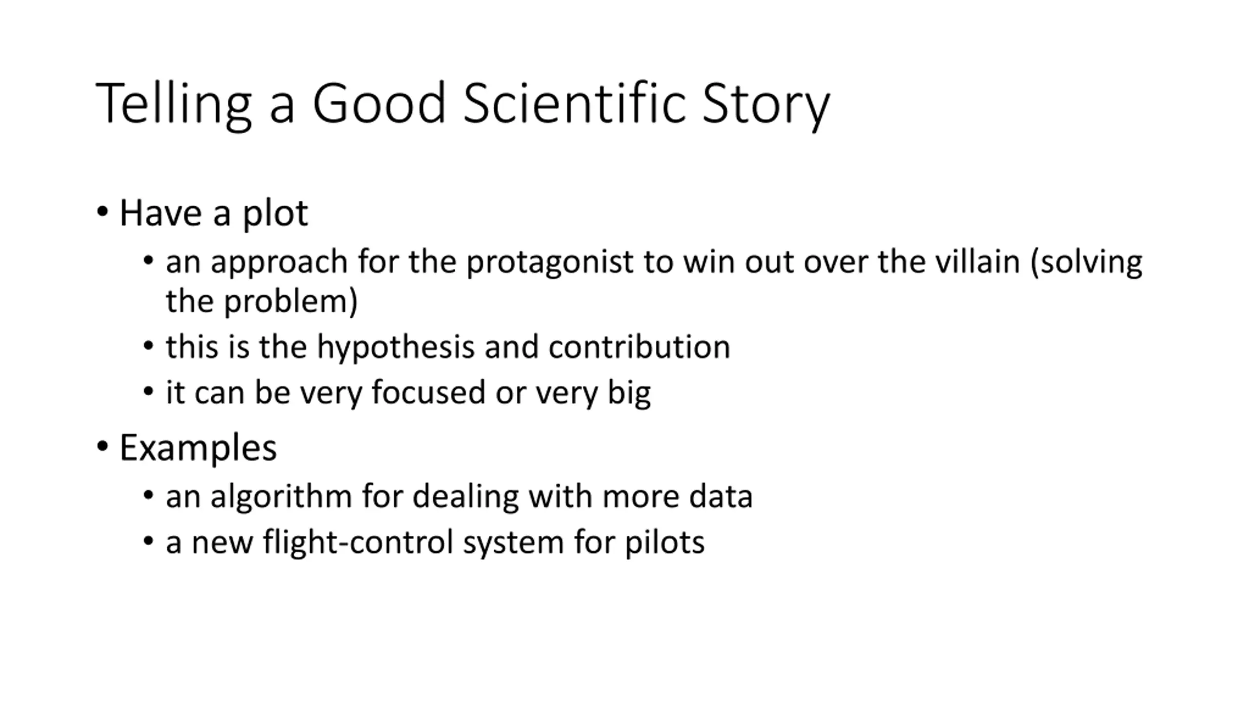 Telling a Good Scientific Story Have a plot an approach for the protagonist to win out over the villain (solving the problem) this is the hypothesis and contribution it can be very focused or very big Examples an algorithm for dealing with more data a new flight-control system for pilots