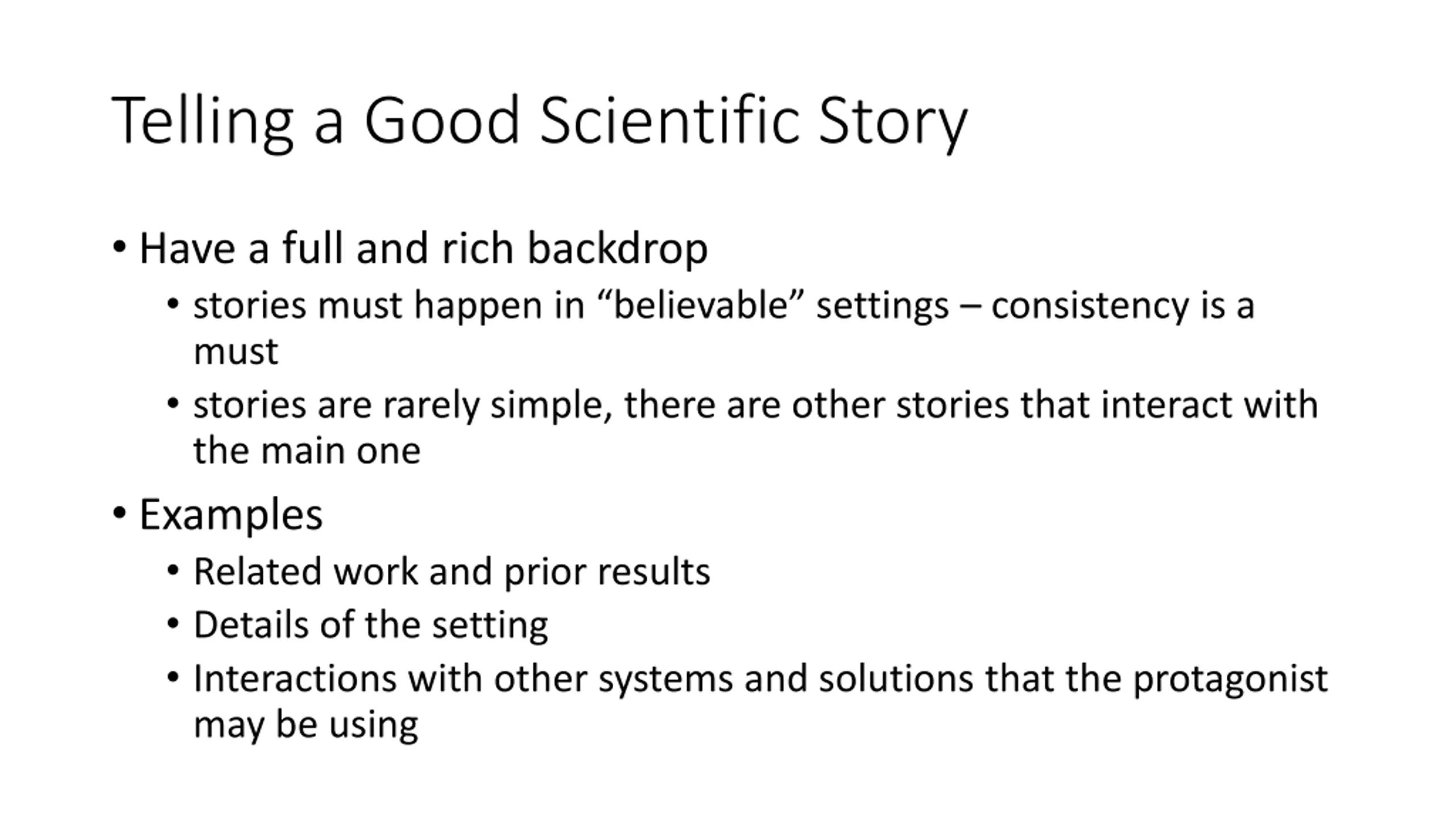Telling a Good Scientific Story Have a full and rich backdrop stories must happen in believable settings consistency is a must stories are rarely simple, there are other stories that interact with the main one Examples Related work and prior results Details of the setting Interactions with other systems and solutions that the protagonist may be using