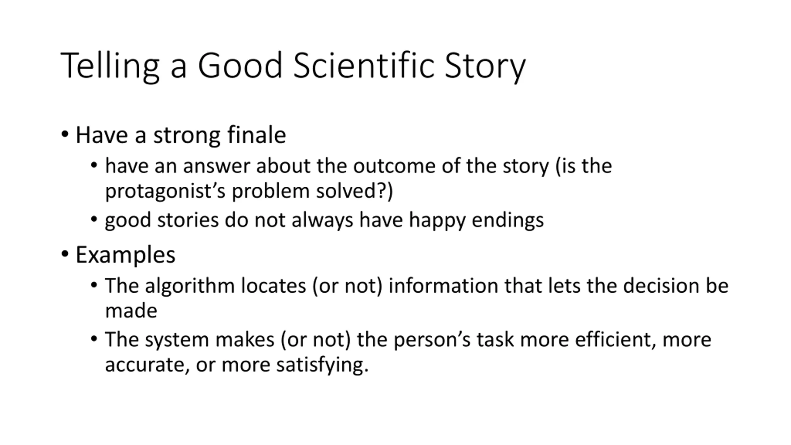 Telling a Good Scientific Story Have a strong finale have an answer about the outcome of the story (is the protagonist s problem solved?) good stories do not always have happy endings Examples The algorithm locates (or not) information that lets the decision be made The system makes (or not) the person s task more efficient, more accurate, or more satisfying.