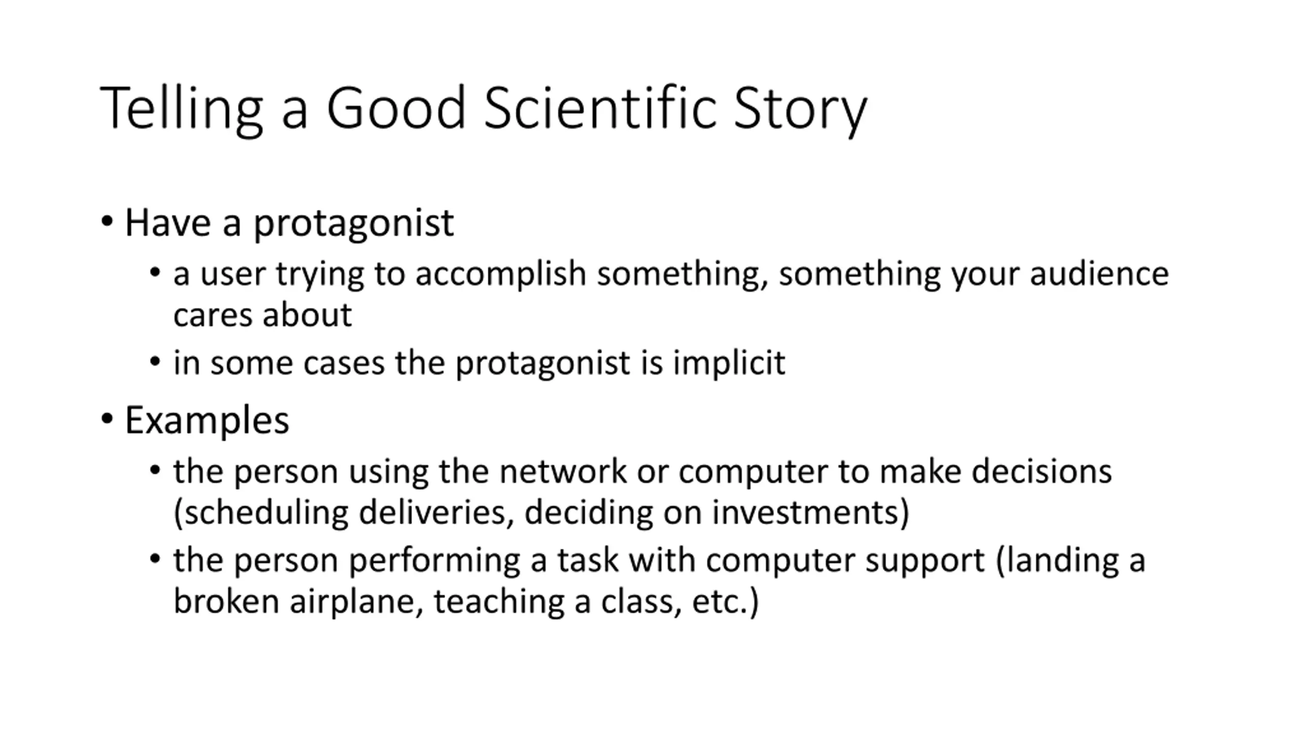 Telling a Good Scientific Story Have a protagonist a user trying to accomplish something, something your audience cares about in some cases the protagonist is implicit Examples the person using the network or computer to make decisions (scheduling deliveries, deciding on investments) the person performing a task with computer support (landing a broken airplane, teaching a class, etc.)