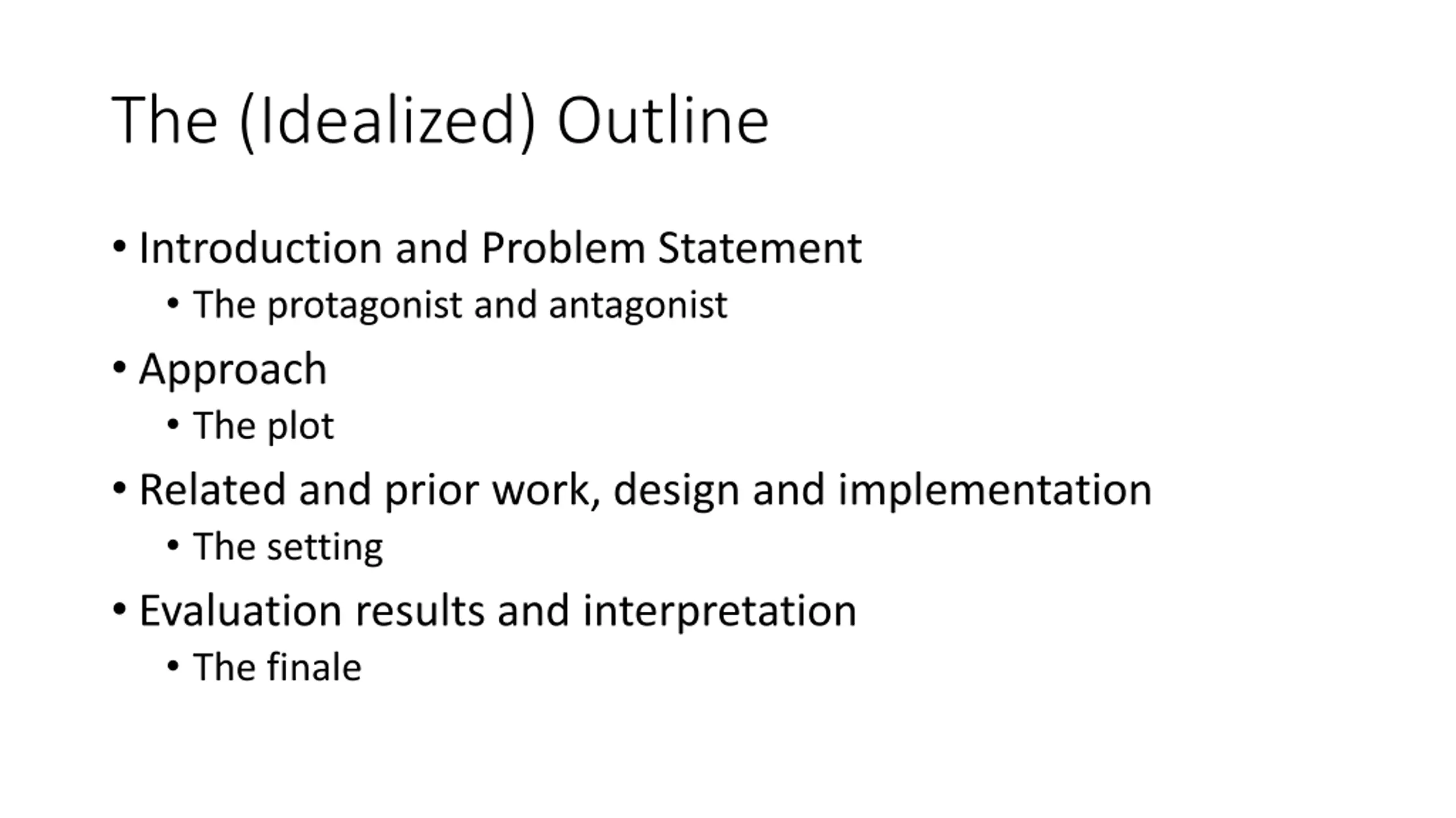 The (Idealized) Outline Introduction and Problem Statement The protagonist and antagonist Approach The plot Related and prior work, design and implementation The setting Evaluation results and interpretation The finale