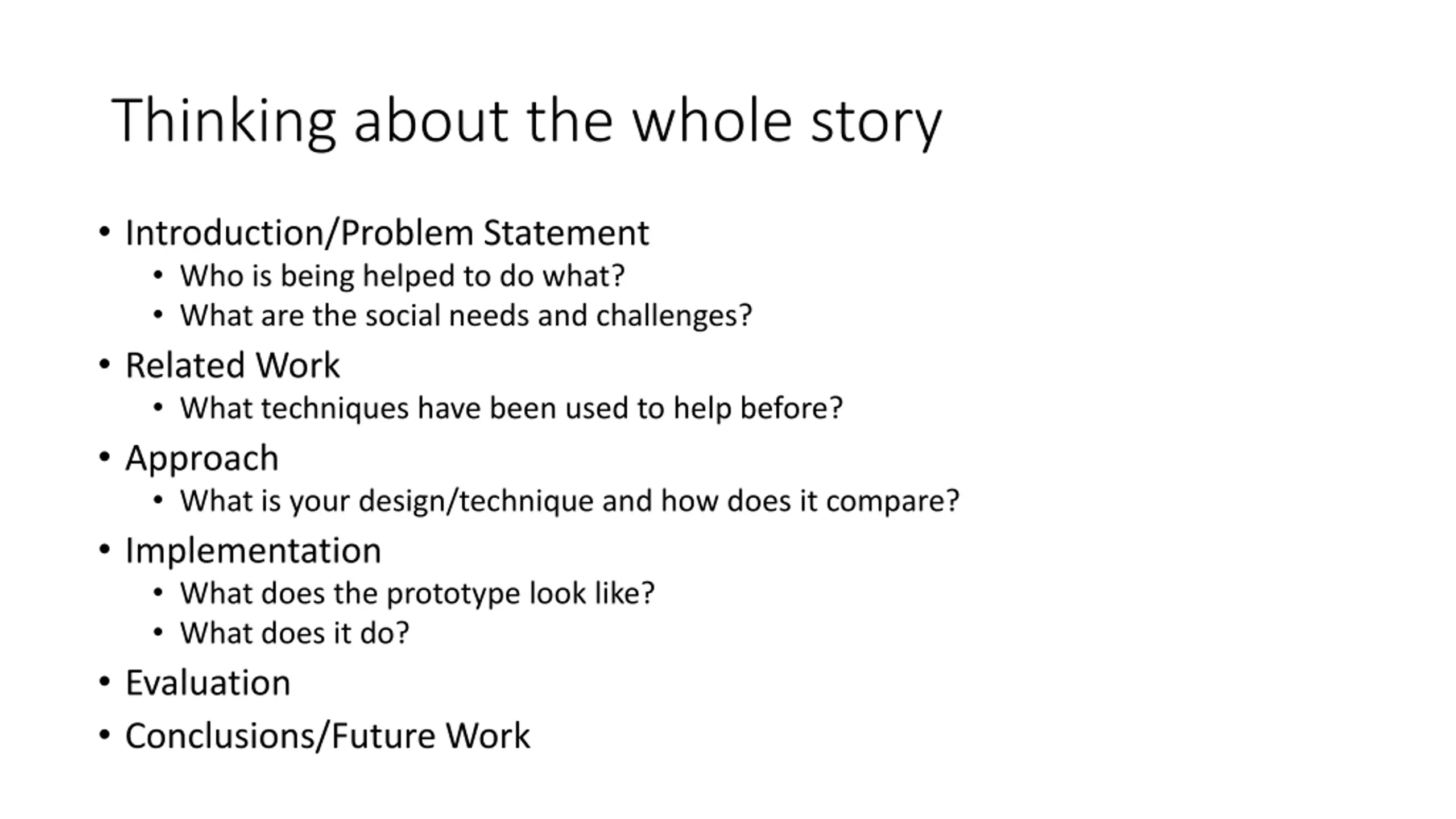 Thinking about the whole story Introduction/Problem Statement Who is being helped to do what? What are the social needs and challenges? Related Work What techniques have been used to help before? Approach What is your design/technique and how does it compare? Implementation What does the prototype look like? What does it do? Evaluation Conclusions/Future Work