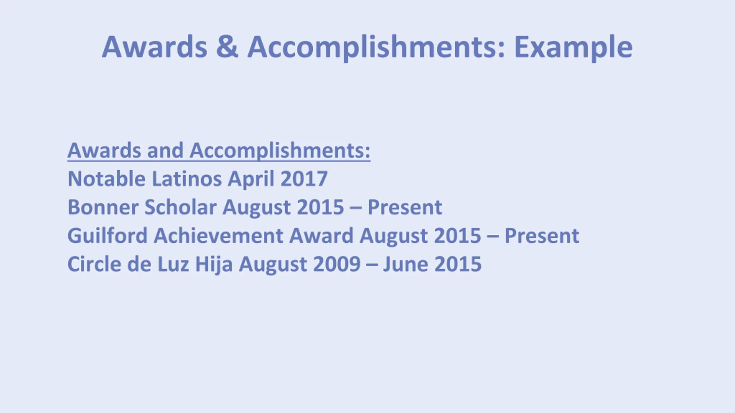 Awards & Accomplishments: Example Awards and Accomplishments: Notable Latinos April 2017 Bonner Scholar August 2015 Present Guilford Achievement Award August 2015 Present Circle de Luz Hija August 2009 June 2015