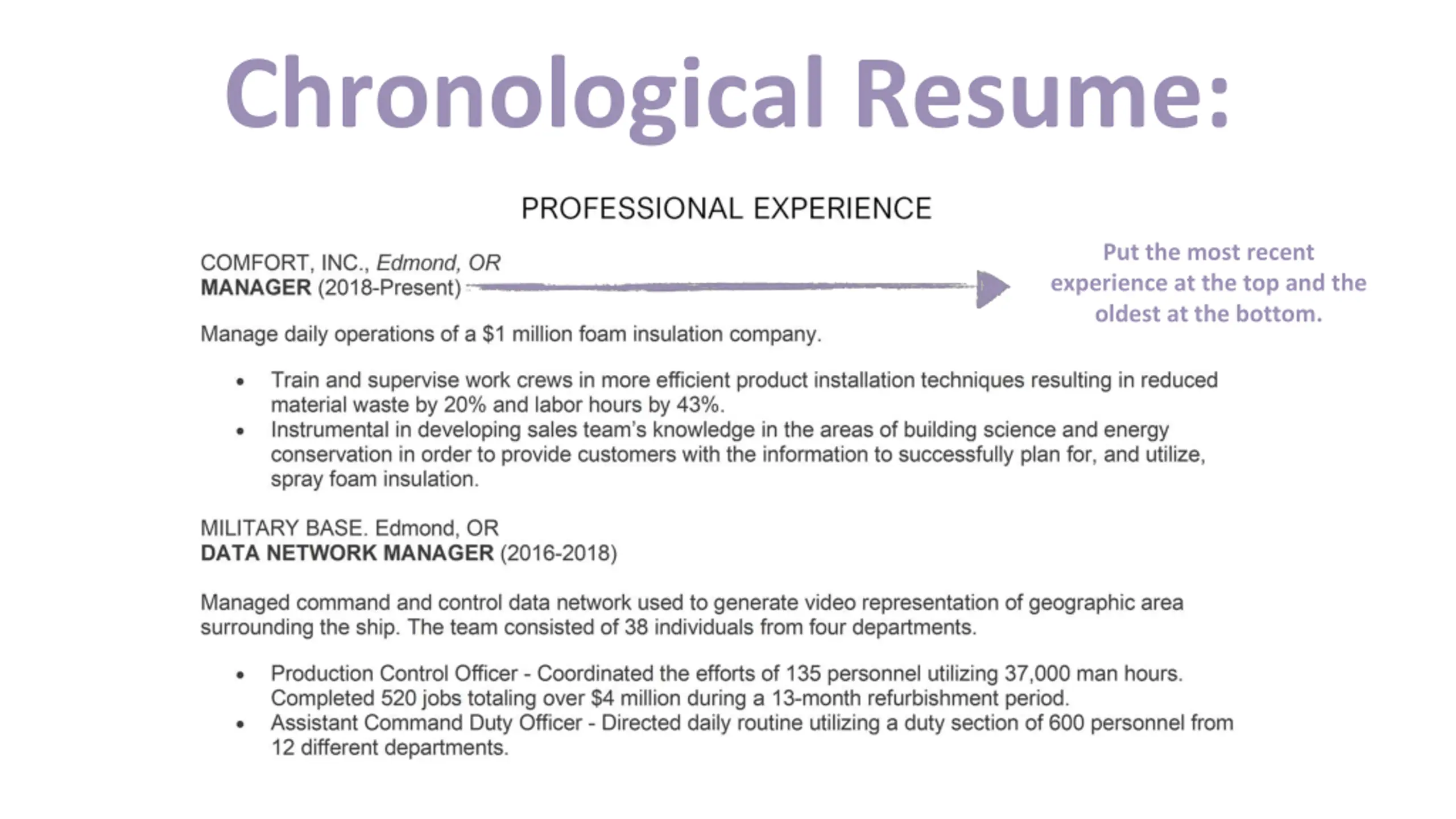 Chronological Resume: Put the most recent experience at the top and the oldest at the bottom.