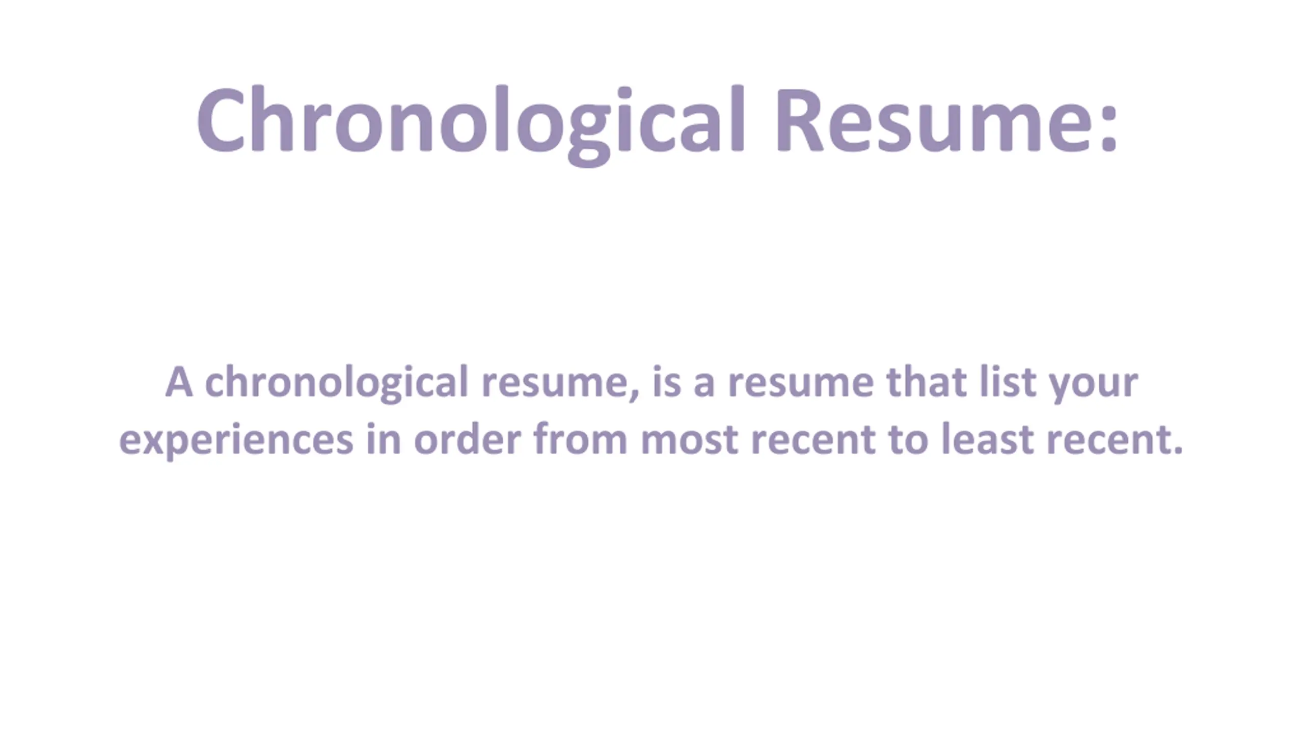 Chronological Resume: A chronological resume, is a resume that list your experiences in order from most recent to least recent.