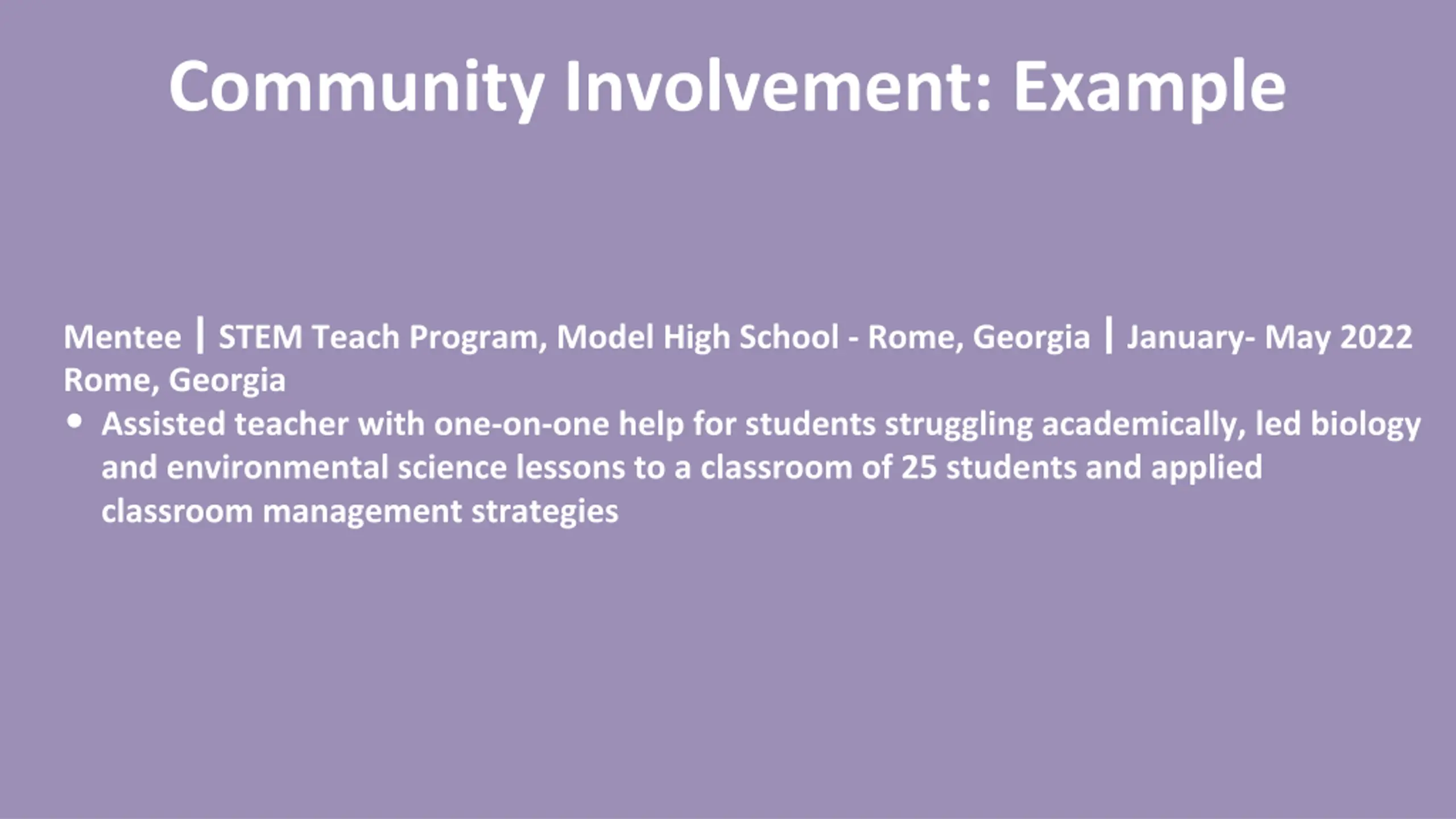 Community Involvement: Example Mentee Rome, Georgia Assisted teacher with one-on-one help for students struggling academically, led biology and environmental science lessons to a classroom of 25 students and applied classroom management strategies STEM Teach Program, Model High School - Rome, Georgia January- May 2022