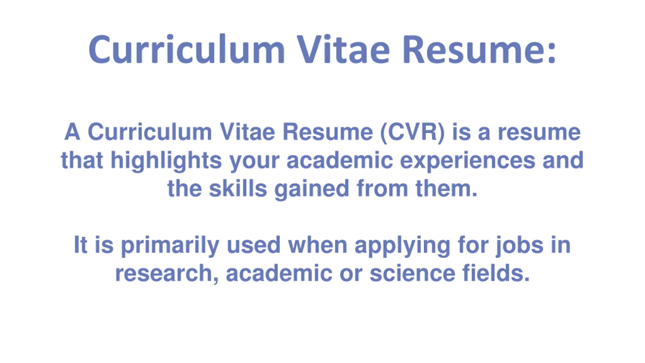 Curriculum Vitae Resume: A Curriculum Vitae Resume (CVR) is a resume that highlights your academic experiences and the skills gained from them. It is primarily used when applying for jobs in research, academic or science fields.