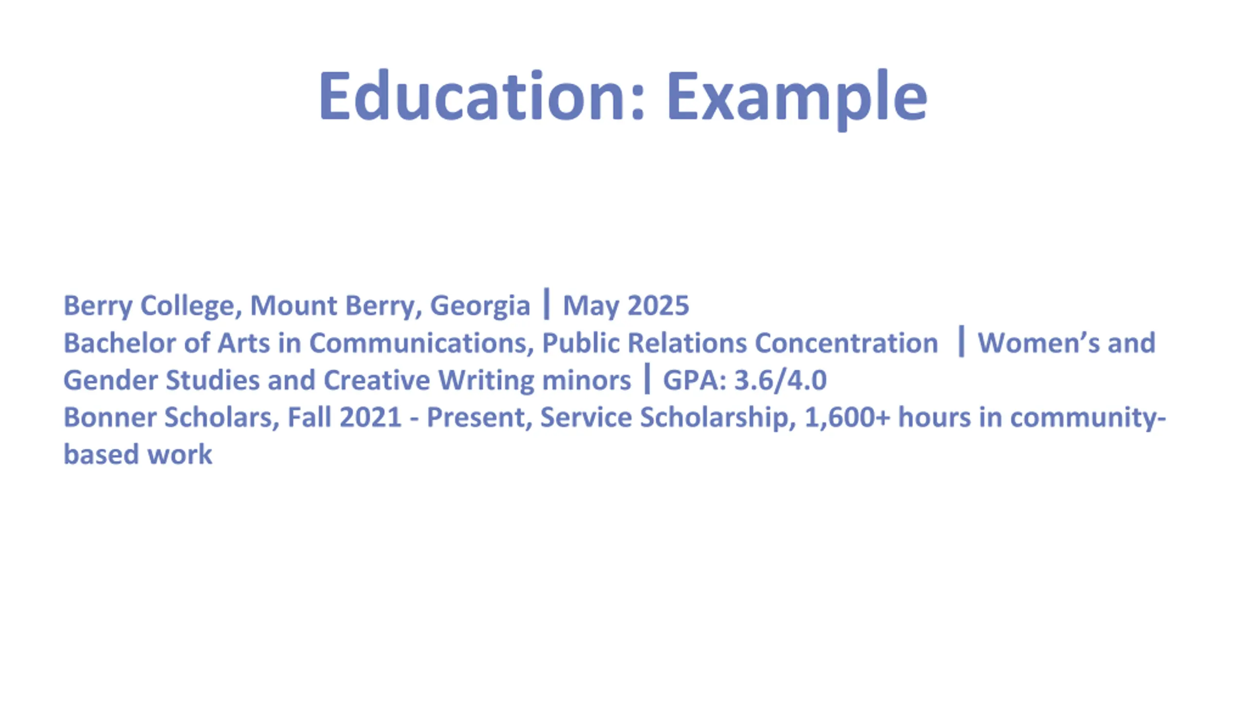 Education: Example Berry College, Mount Berry, Georgia Bachelor of Arts in Communications, Public Relations Concentration Gender Studies and Creative Writing minors Bonner Scholars, Fall 2021 - Present, Service Scholarship, 1,600+ hours in community- based work May 2025 Women s and GPA: 3.6/4.0
