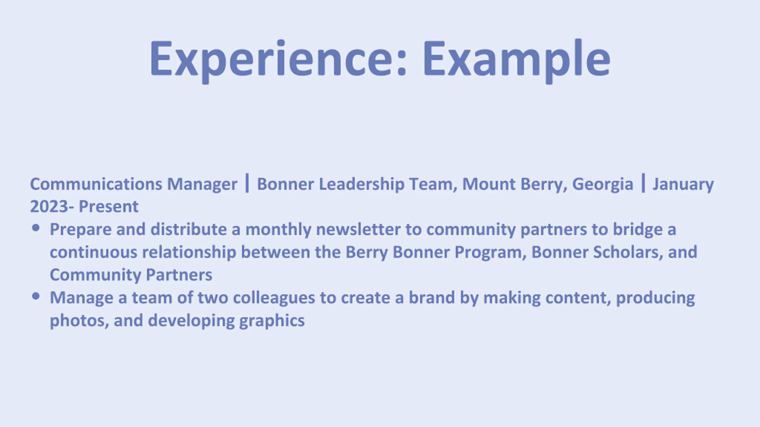 Experience: Example Communications Manager 2023- Present Prepare and distribute a monthly newsletter to community partners to bridge a continuous relationship between the Berry Bonner Program, Bonner Scholars, and Community Partners Manage a team of two colleagues to create a brand by making content, producing photos, and developing graphics Bonner Leadership Team, Mount Berry, Georgia January