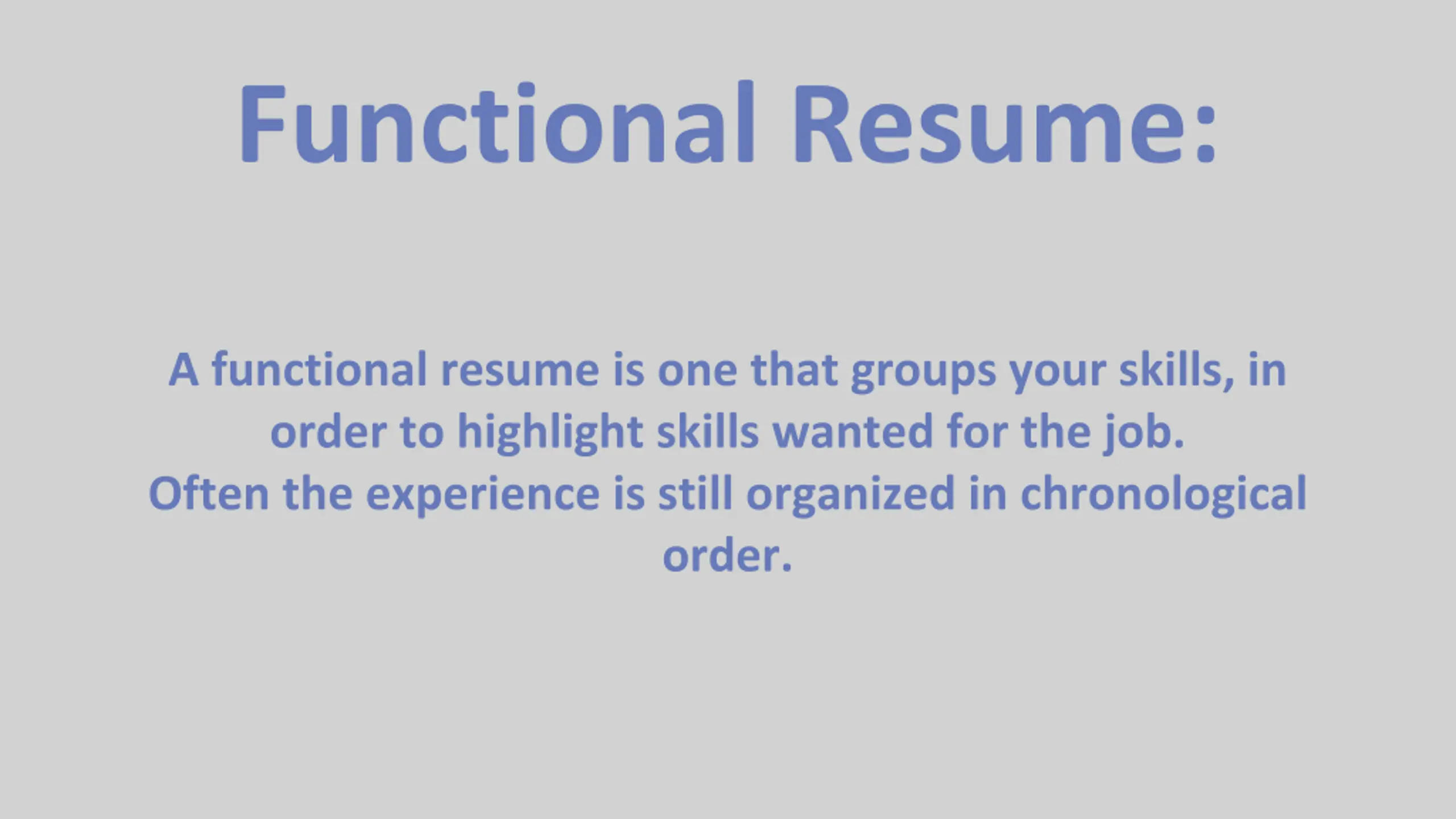 Functional Resume: A functional resume is one that groups your skills, in order to highlight skills wanted for the job. Often the experience is still organized in chronological order.