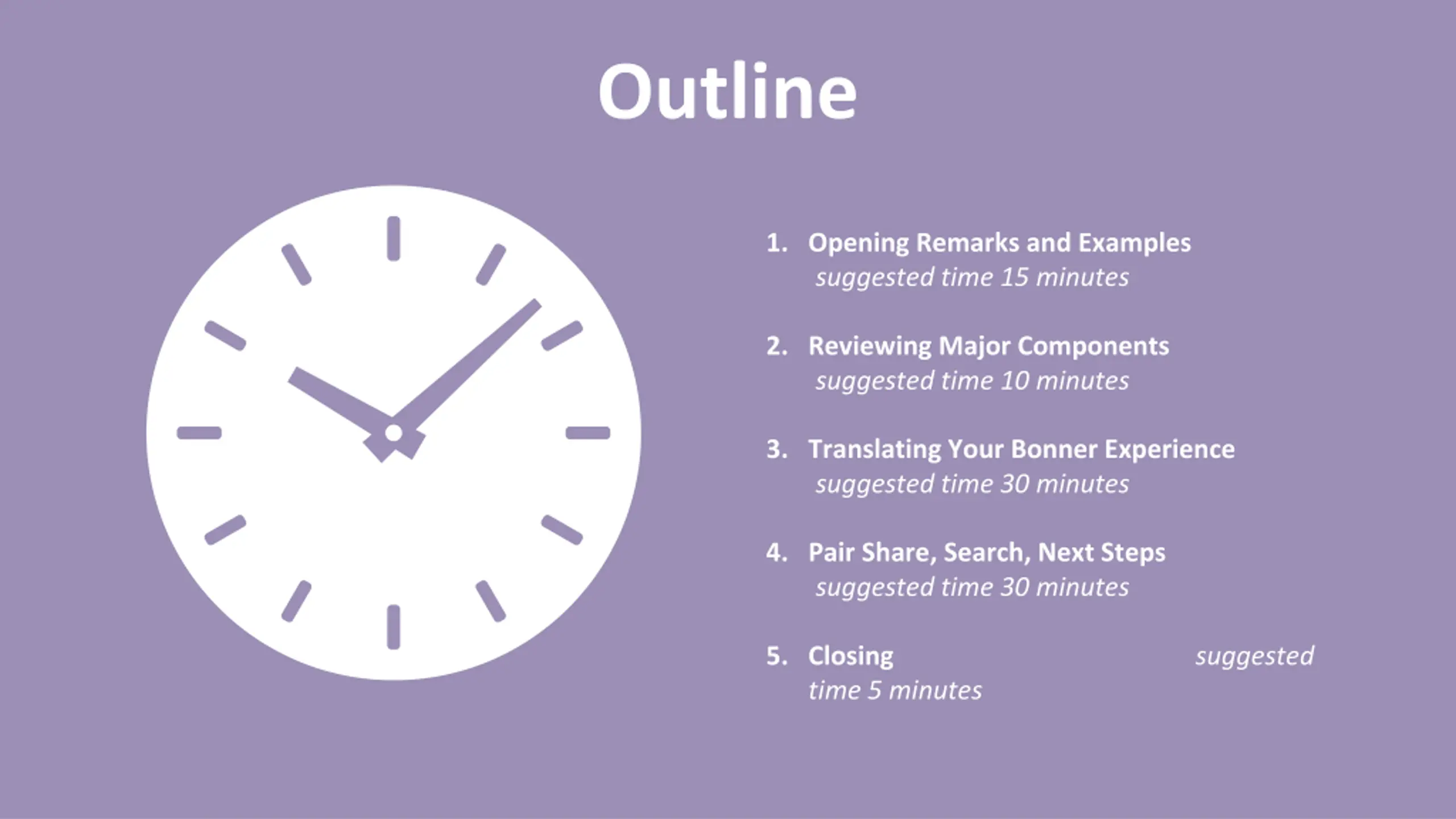 Outline 1. Opening Remarks and Examples suggested time 15 minutes 2. Reviewing Major Components suggested time 10 minutes 3. Translating Your Bonner Experience suggested time 30 minutes 4. Pair Share, Search, Next Steps suggested time 30 minutes 5. Closing suggested time 5 minutes