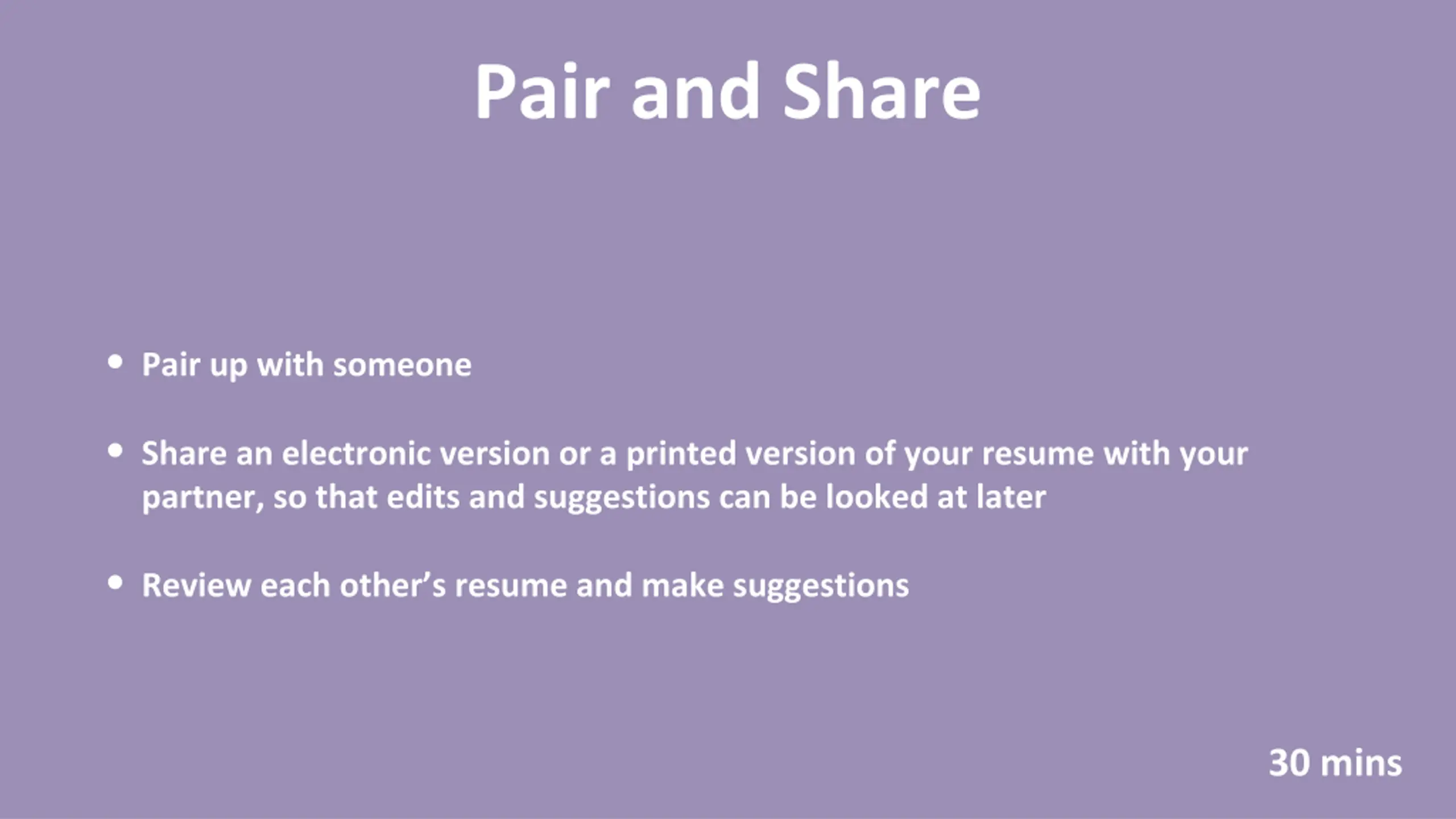 Pair and Share Pair up with someone Share an electronic version or a printed version of your resume with your partner, so that edits and suggestions can be looked at later Review each other s resume and make suggestions 30 mins