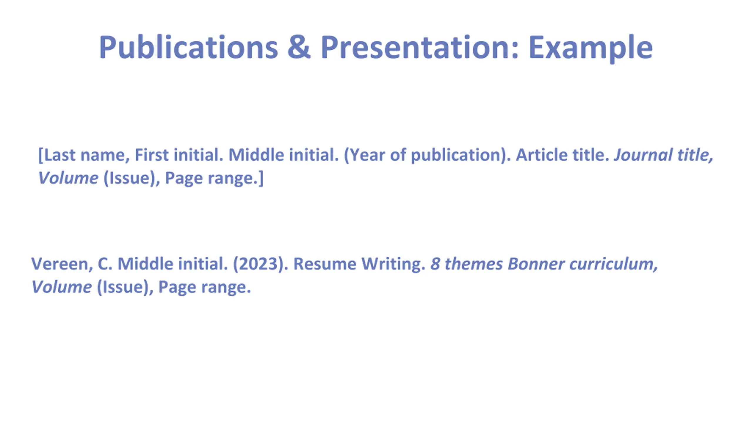 Publications & Presentation: Example [Last name, First initial. Middle initial. (Year of publication). Article title. Journal title, Volume (Issue), Page range.] Vereen, C. Middle initial. (2023). Resume Writing. 8 themes Bonner curriculum, Volume (Issue), Page range.