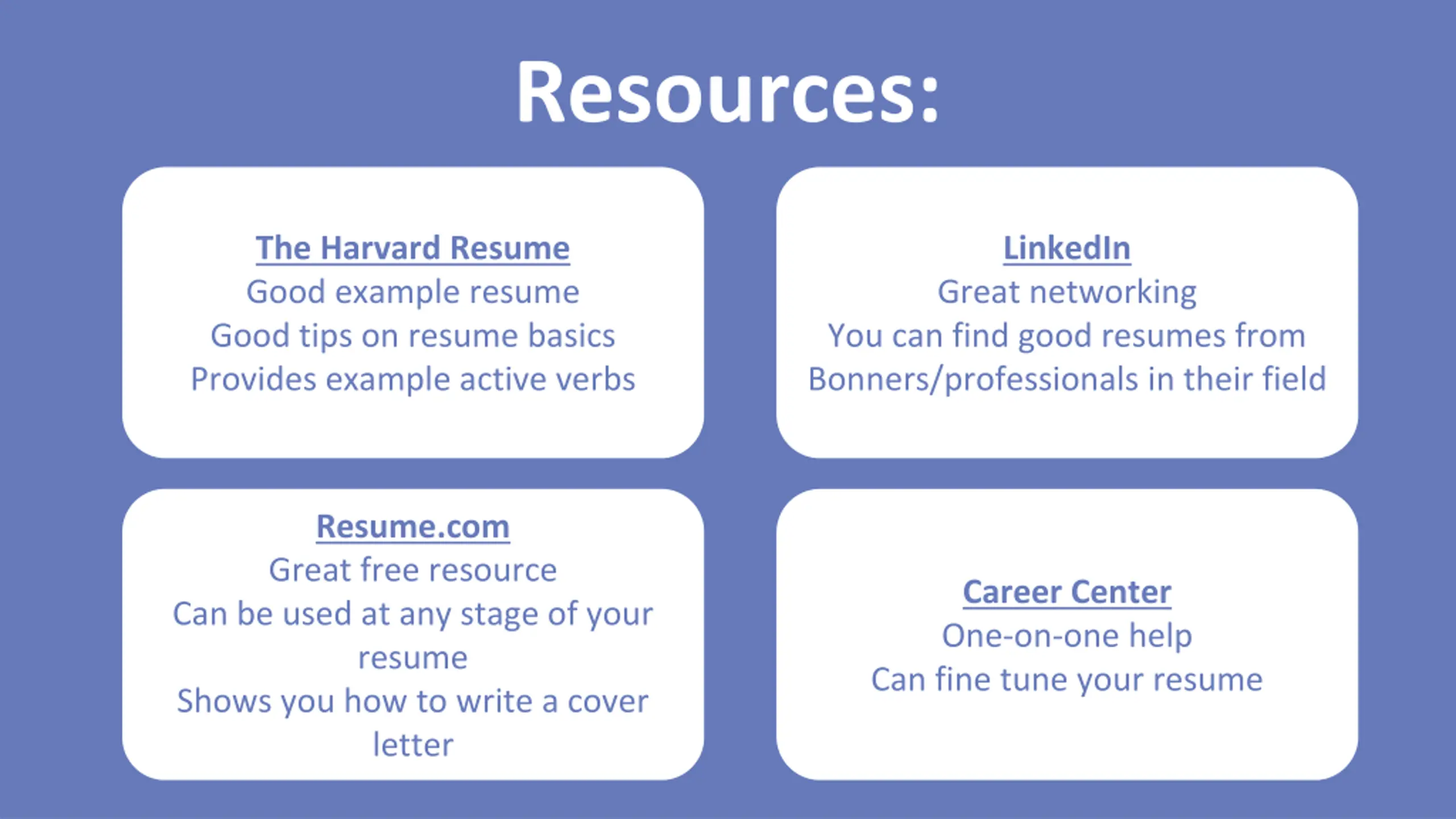 Resources: The Harvard Resume Good example resume Good tips on resume basics Provides example active verbs LinkedIn Great networking You can find good resumes from Bonners/professionals in their field Resume.com Great free resource Can be used at any stage of your resume Shows you how to write a cover letter Career Center One-on-one help Can fine tune your resume