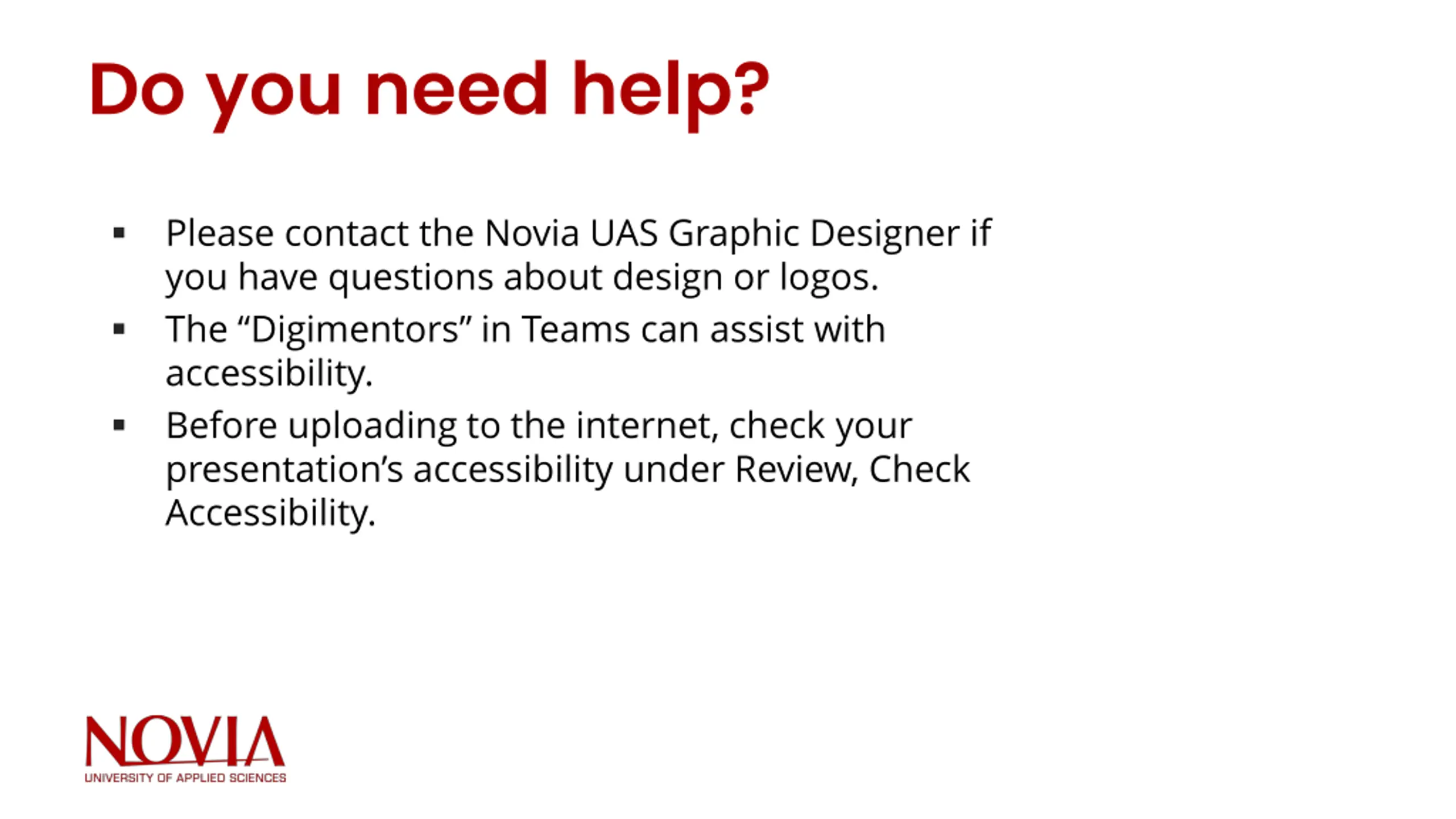 Do you need help? Please contact the Novia UAS Graphic Designer if you have questions about design or logos. The Digimentors in Teams can assist with accessibility. Before uploading to the internet, check your presentation s accessibility under Review, Check Accessibility.