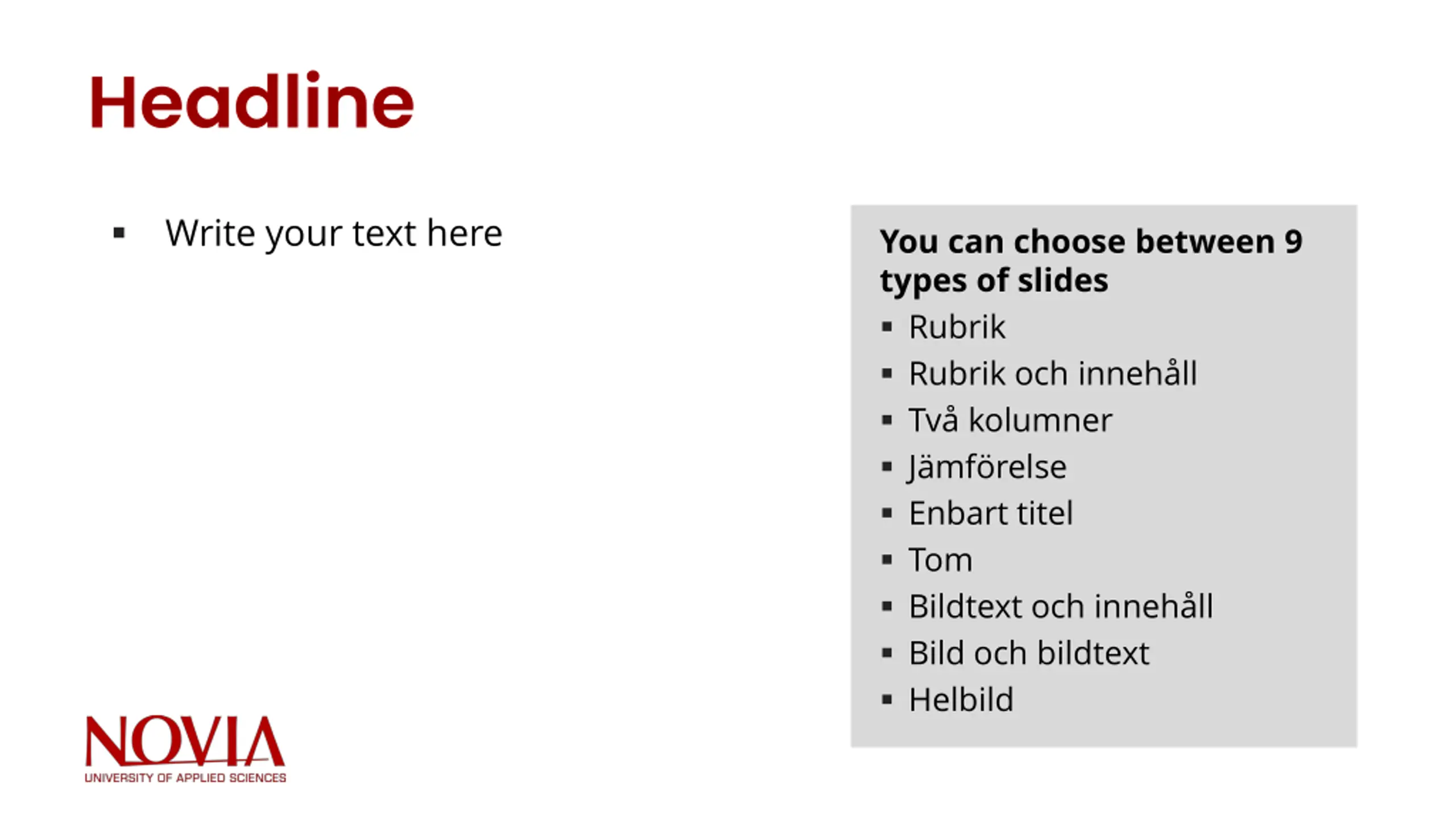 Headline Write your text here You can choose between 9 types of slides Rubrik Rubrik och inneh ll Tv kolumner J mf relse Enbart titel Tom Bildtext och inneh ll Bild och bildtext Helbild