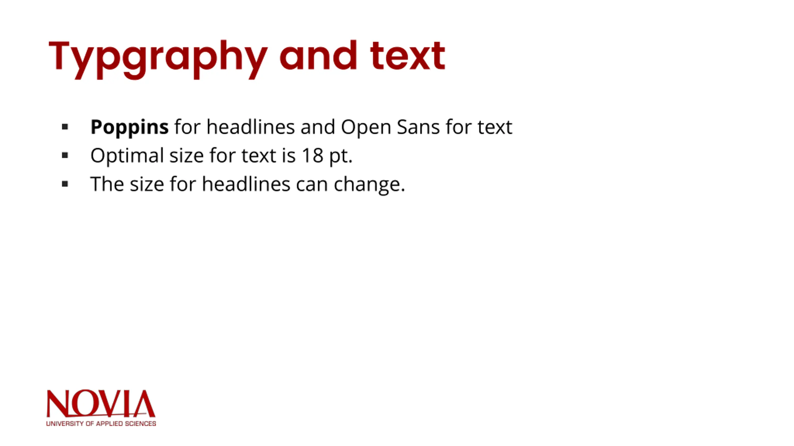 Typgraphy and text Poppins for headlines and Open Sans for text Optimal size for text is 18 pt. The size for headlines can change.