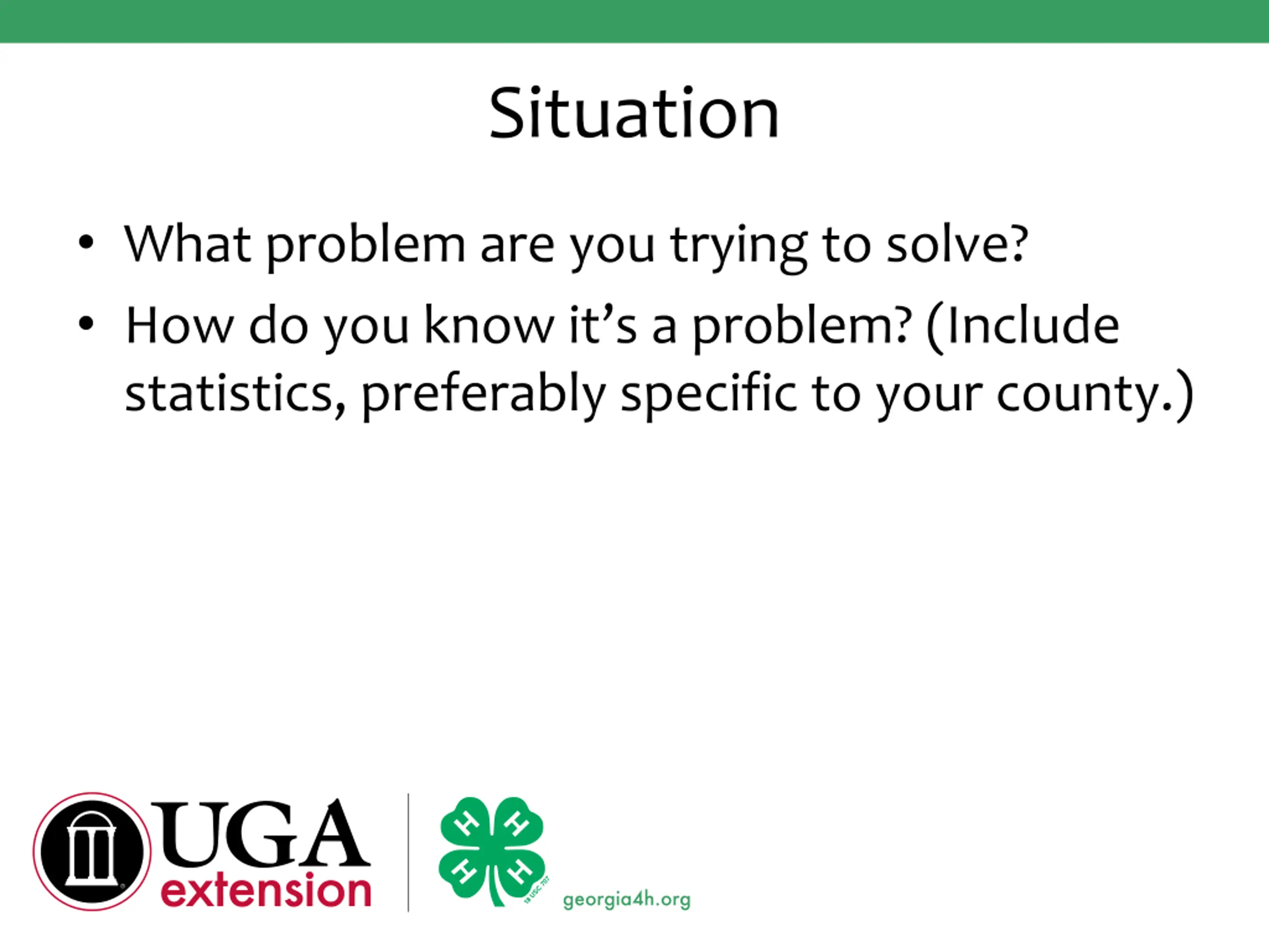 Situation What problem are you trying to solve? How do you know it s a problem? (Include statistics, preferably specific to your county.)