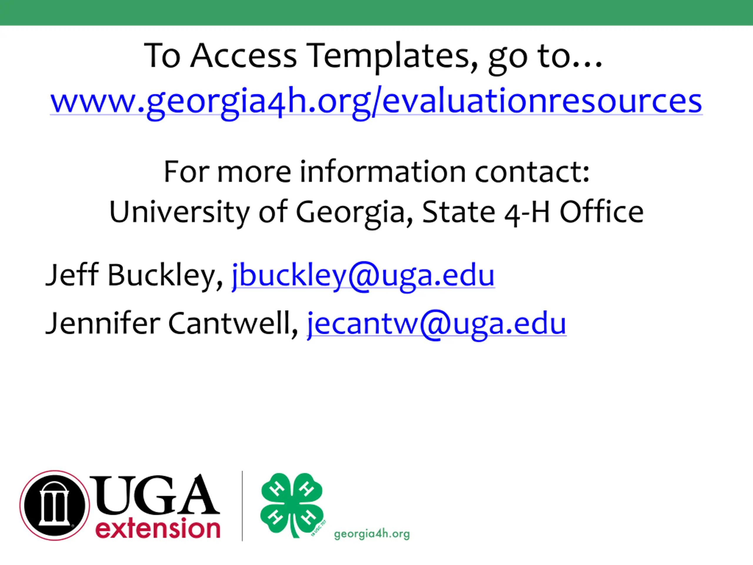 To Access Templates, go to www.georgia4h.org/evaluationresources For more information contact: University of Georgia, State 4-H Office Jeff Buckley, jbuckley@uga.edu Jennifer Cantwell, jecantw@uga.edu