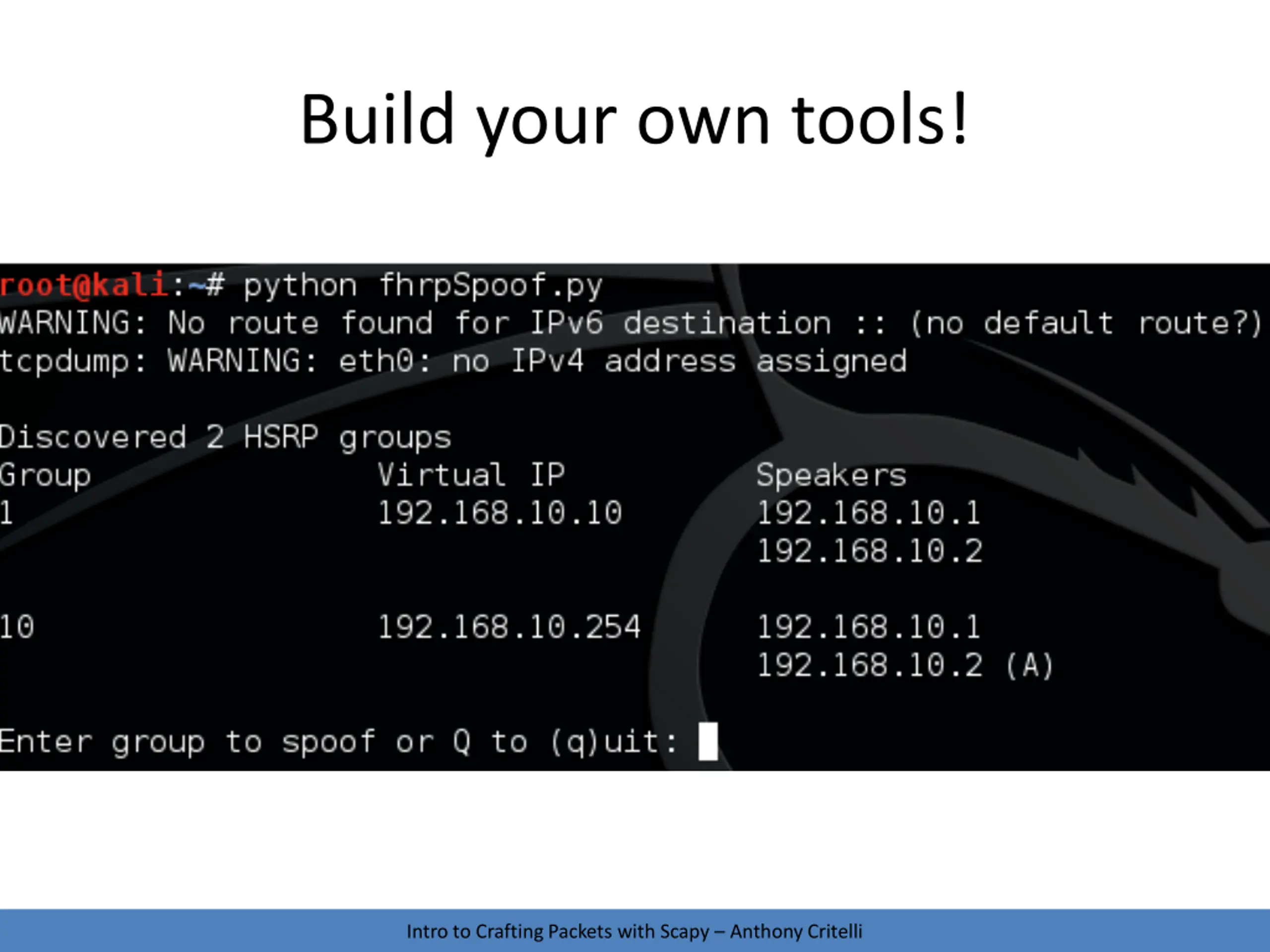 Build your own tools! Intro to Crafting Packets with Scapy Anthony Critelli