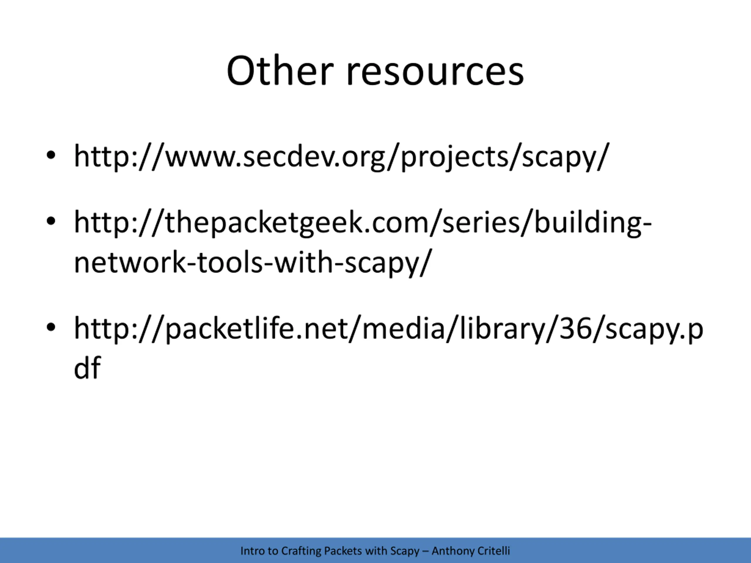 Questions? Comments? www.acritelli.com critellia@gmail.com @acritelli Intro to Crafting Packets with Scapy Anthony Critelli