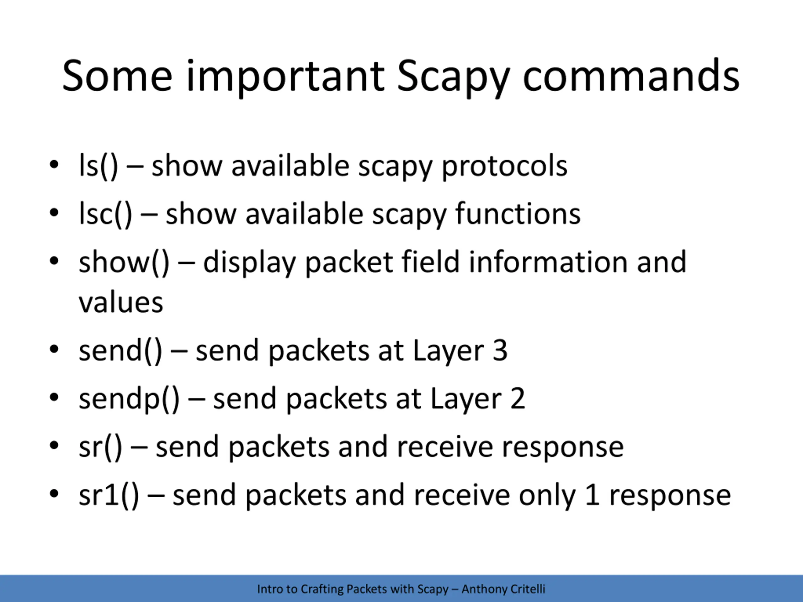 Some important Scapy commands ls() show available scapy protocols lsc() show available scapy functions show() display packet field information and values send() send packets at Layer 3 sendp() send packets at Layer 2 sr() send packets and receive response sr1() send packets and receive only 1 response Intro to Crafting Packets with Scapy Anthony Critelli