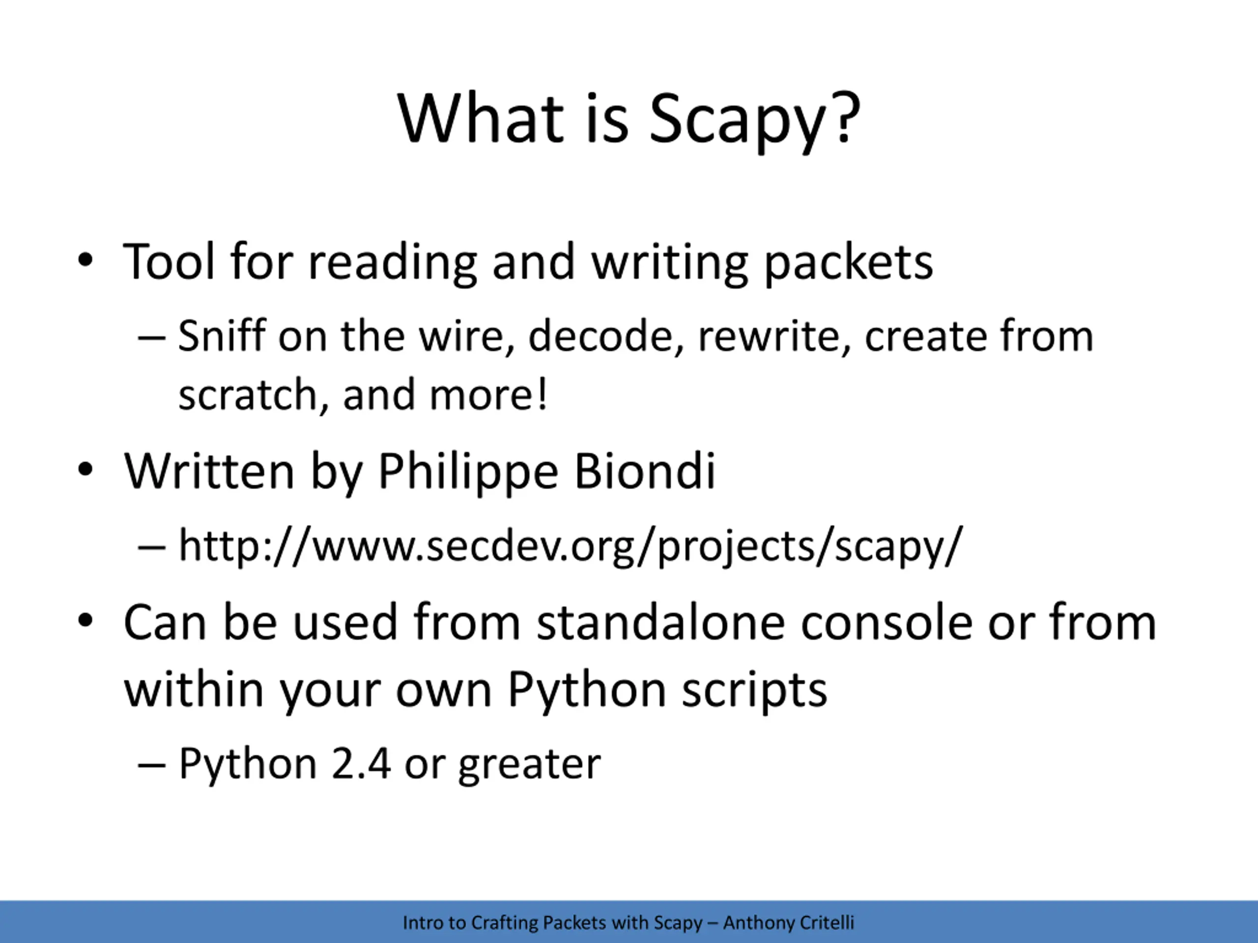 What is Scapy? Tool for reading and writing packets Sniff on the wire, decode, rewrite, create from scratch, and more! Written by Philippe Biondi http://www.secdev.org/projects/scapy/ Can be used from standalone console or from within your own Python scripts Python 2.4 or greater Intro to Crafting Packets with Scapy Anthony Critelli
