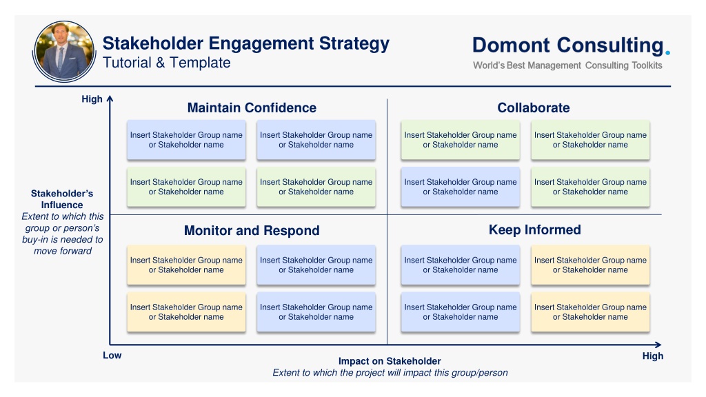 Stakeholder Engagement Strategy Tutorial & Template High Maintain Confidence Collaborate Insert Stakeholder Group name or Stakeholder name Insert Stakeholder Group name or Stakeholder name Insert Stakeholder Group name or Stakeholder name Insert Stakeholder Group name or Stakeholder name Insert Stakeholder Group name or Stakeholder name Insert Stakeholder Group name or Stakeholder name Insert Stakeholder Group name or Stakeholder name Insert Stakeholder Group name or Stakeholder name Stakeholder s Influence Extent to which this group or person s buy-in is needed to move forward Keep Informed Monitor and Respond Insert Stakeholder Group name or Stakeholder name Insert Stakeholder Group name or Stakeholder name Insert Stakeholder Group name or Stakeholder name Insert Stakeholder Group name or Stakeholder name Insert Stakeholder Group name or Stakeholder name Insert Stakeholder Group name or Stakeholder name Insert Stakeholder Group name or Stakeholder name Insert Stakeholder Group name or Stakeholder name Low High Impact on Stakeholder Extent to which the project will impact this group/person