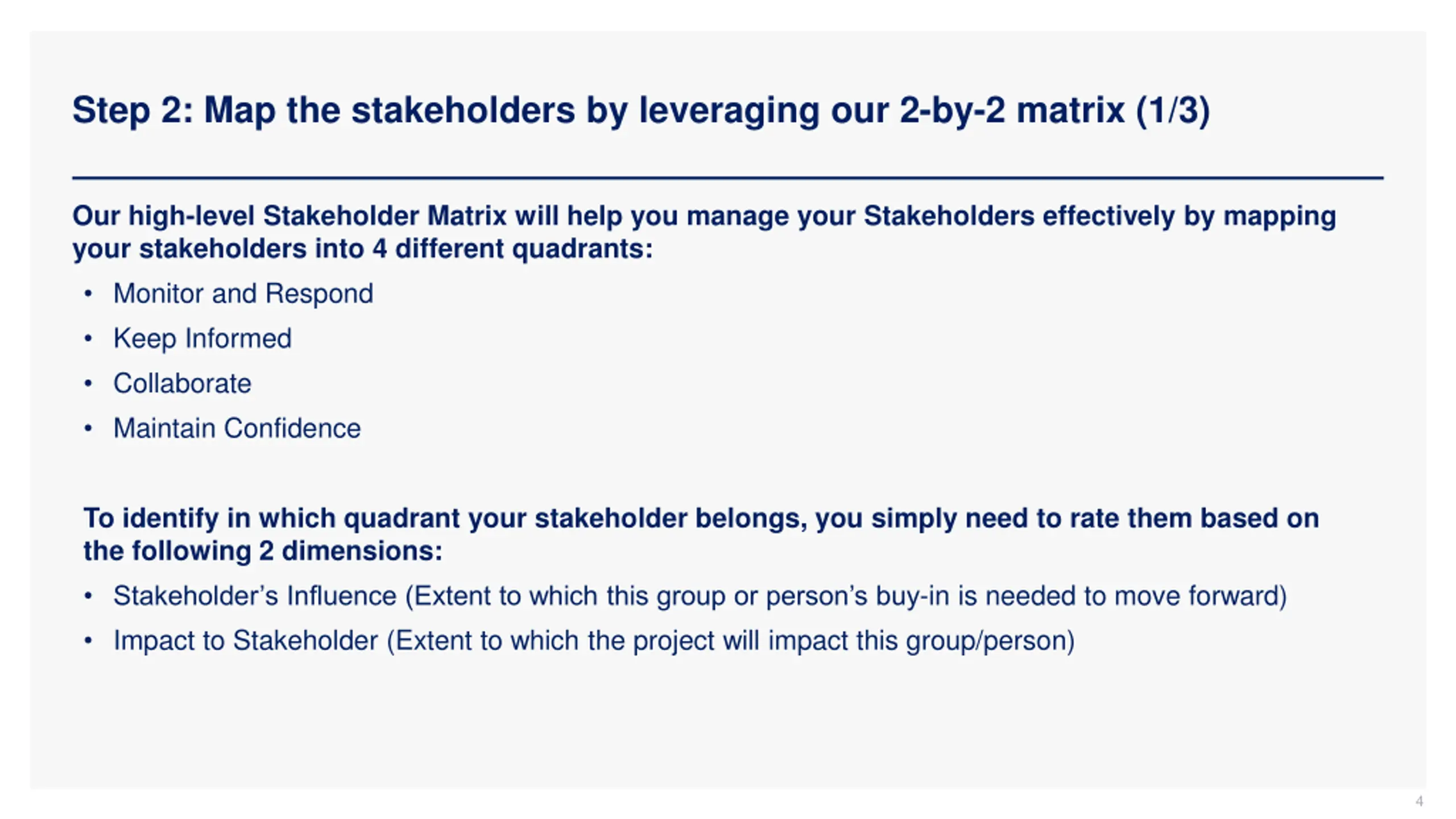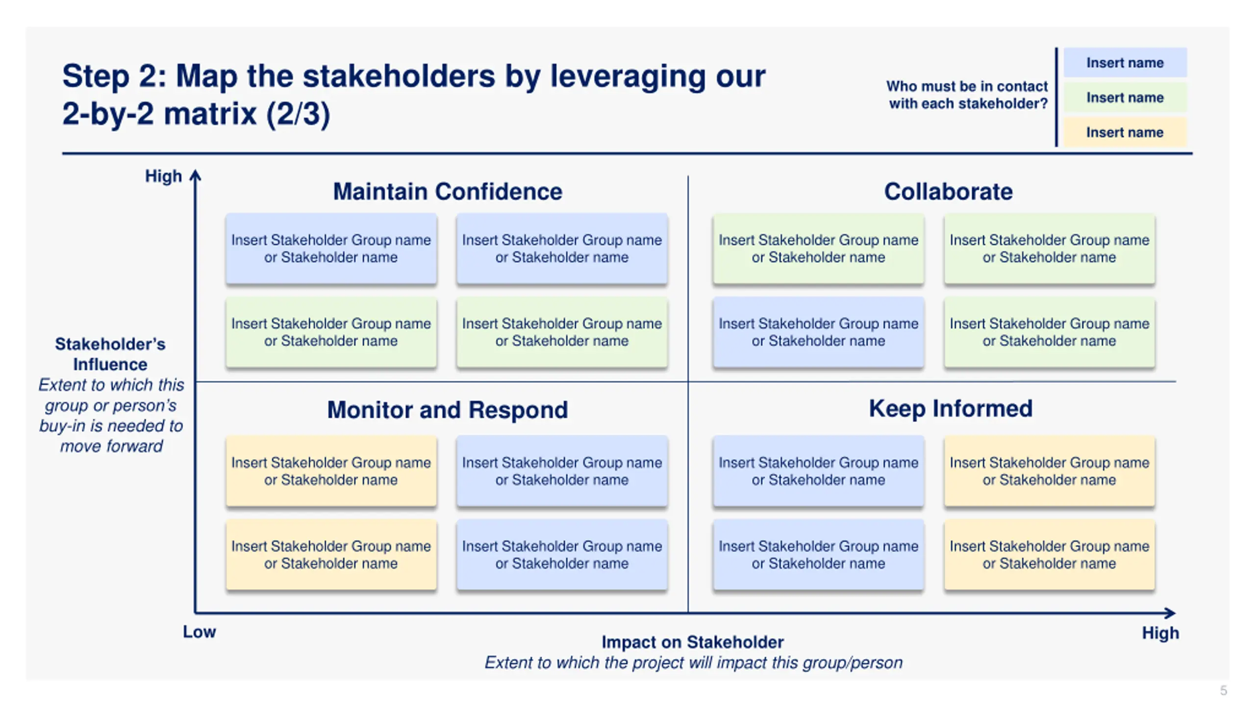 Step 2: Map the stakeholders by leveraging our 2-by-2 matrix (1/3) Our high-level Stakeholder Matrix will help you manage your Stakeholders effectively by mapping your stakeholders into 4 different quadrants: Monitor and Respond Keep Informed Collaborate Maintain Confidence To identify in which quadrant your stakeholder belongs, you simply need to rate them based on the following 2 dimensions: Stakeholder s Influence (Extent to which this group or person s buy-in is needed to move forward) Impact to Stakeholder (Extent to which the project will impact this group/person) 4