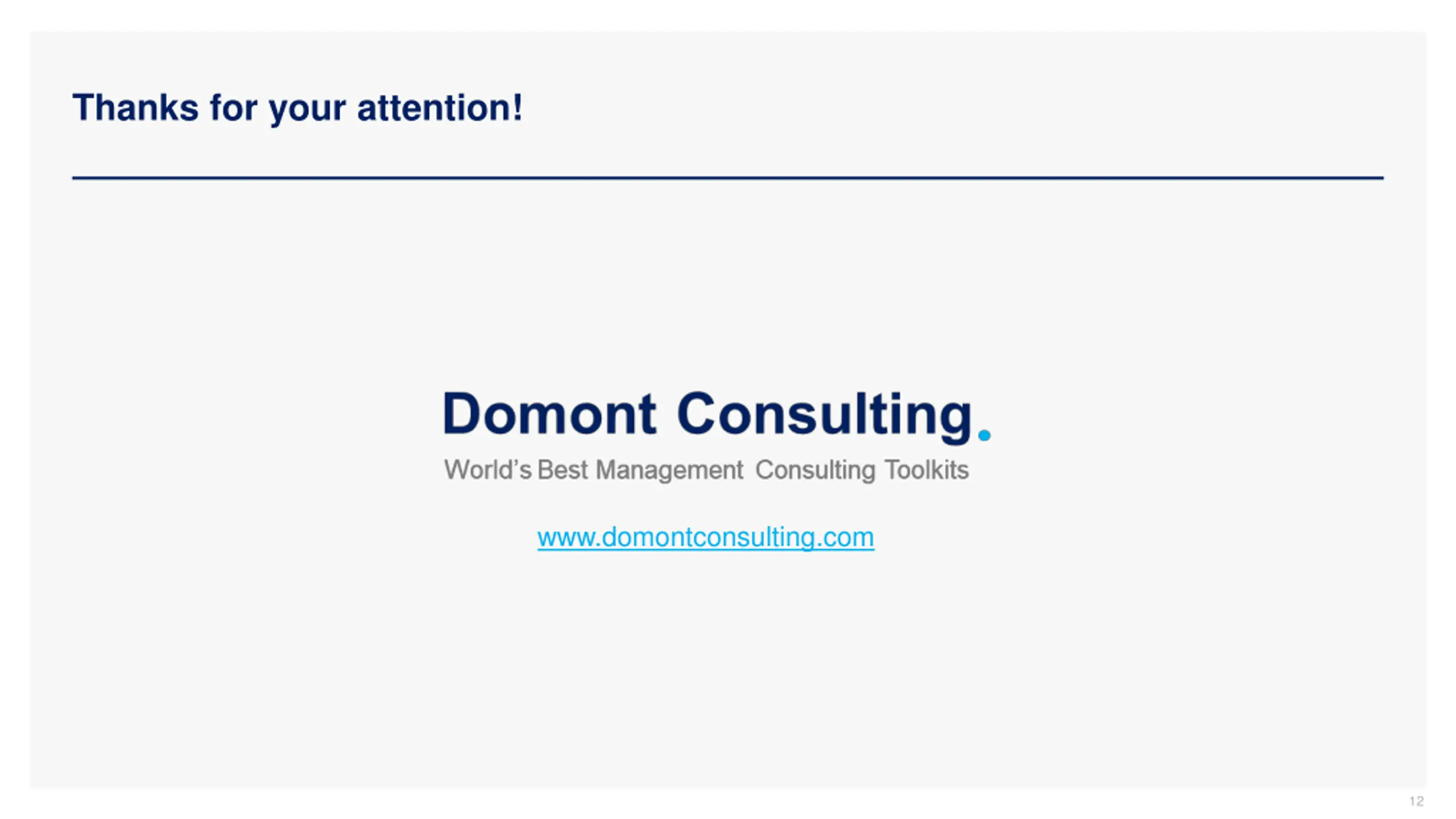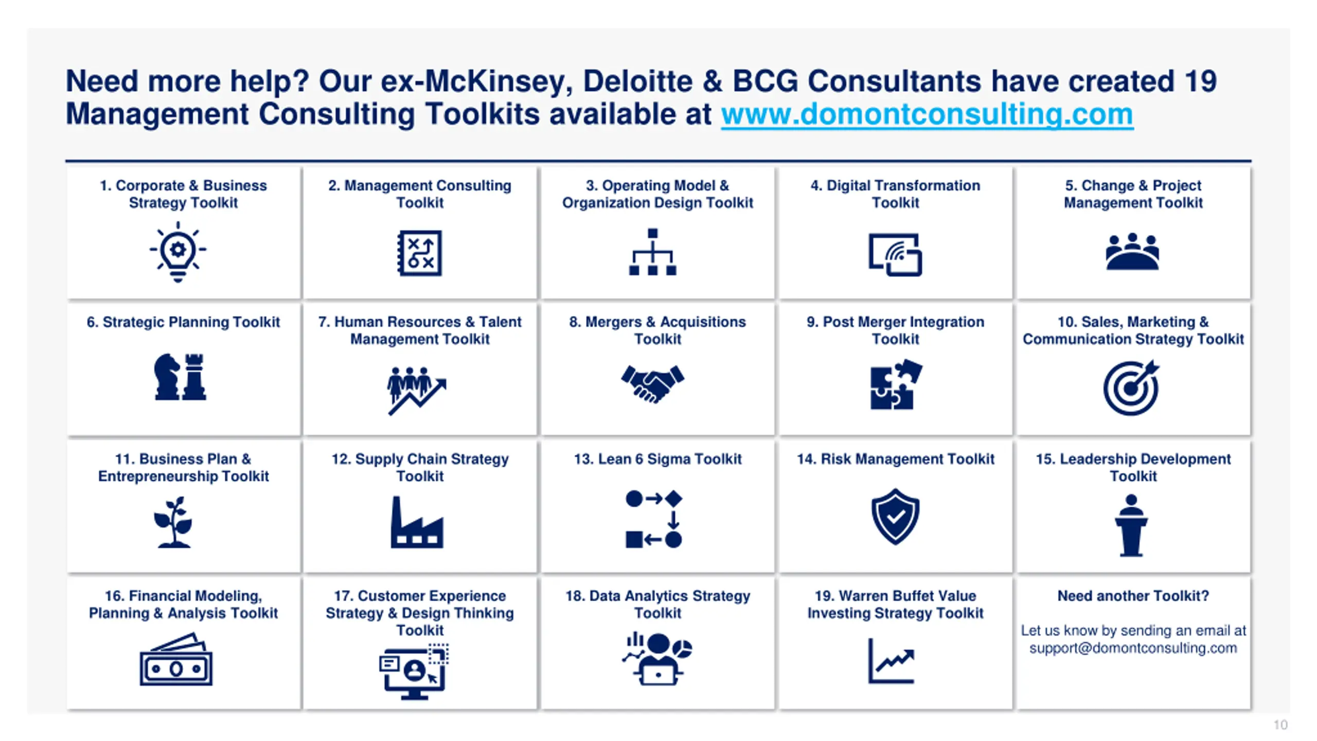 Need more help? Our ex-McKinsey, Deloitte & BCG Consultants have created 19 Management Consulting Toolkits available at www.domontconsulting.com 1. Corporate & Business Strategy Toolkit 2. Management Consulting Toolkit 3. Operating Model & Organization Design Toolkit 4. Digital Transformation Toolkit 5. Change & Project Management Toolkit 7. Human Resources & Talent Management Toolkit 8. Mergers & Acquisitions Toolkit 9. Post Merger Integration Toolkit 10. Sales, Marketing & Communication Strategy Toolkit 6. Strategic Planning Toolkit 11. Business Plan & Entrepreneurship Toolkit 12. Supply Chain Strategy Toolkit 13. Lean 6 Sigma Toolkit 14. Risk Management Toolkit 15. Leadership Development Toolkit 16. Financial Modeling, Planning & Analysis Toolkit 17. Customer Experience Strategy & Design Thinking Toolkit 18. Data Analytics Strategy Toolkit 19. Warren Buffet Value Investing Strategy Toolkit Need another Toolkit? Let us know by sending an email at support@domontconsulting.com 10