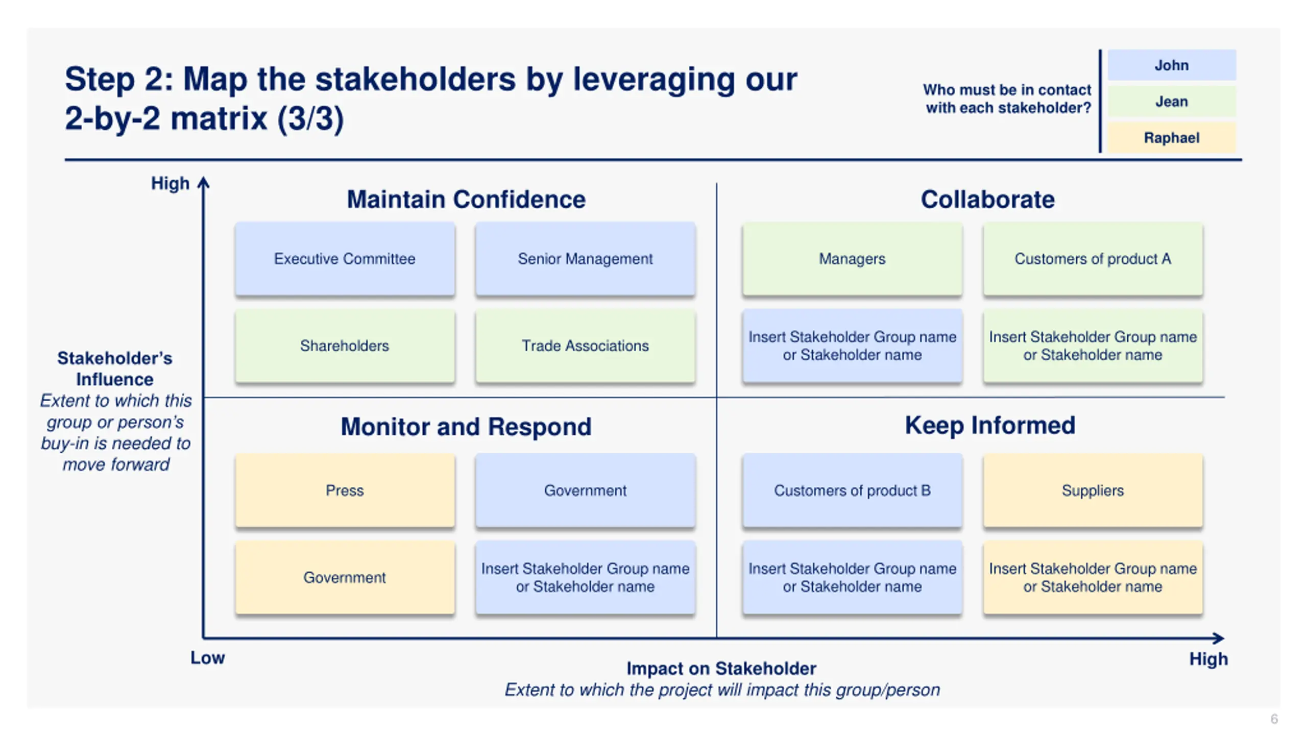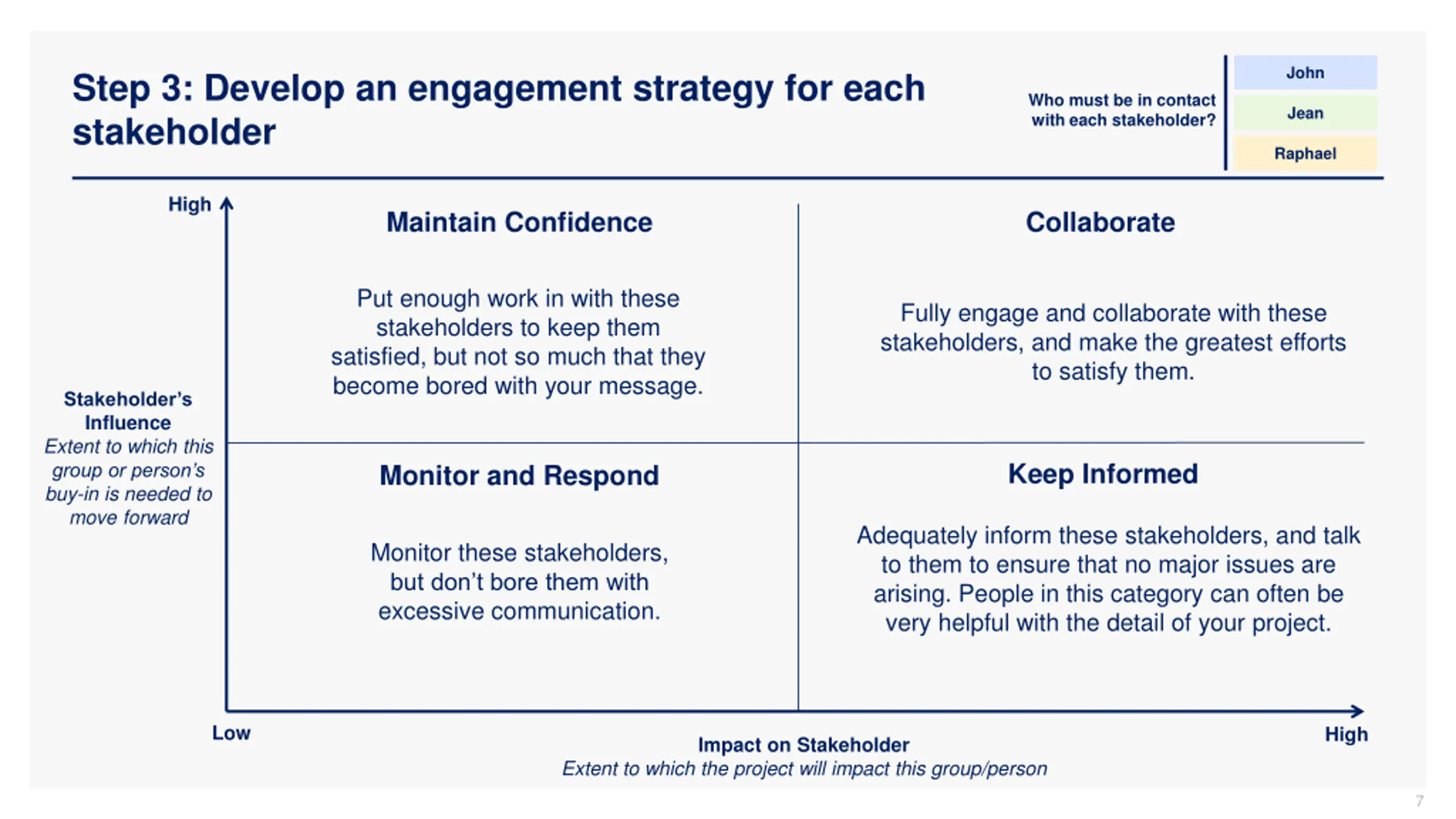 John Step 2: Map the stakeholders by leveraging our 2-by-2 matrix (3/3) Who must be in contact with each stakeholder? Jean Raphael High Maintain Confidence Collaborate Executive Committee Senior Management Managers Customers of product A Insert Stakeholder Group name or Stakeholder name Insert Stakeholder Group name or Stakeholder name Shareholders Trade Associations Stakeholder s Influence Extent to which this group or person s buy-in is needed to move forward Keep Informed Monitor and Respond Press Government Customers of product B Suppliers Insert Stakeholder Group name or Stakeholder name Insert Stakeholder Group name or Stakeholder name Insert Stakeholder Group name or Stakeholder name Government Low High Impact on Stakeholder Extent to which the project will impact this group/person 6