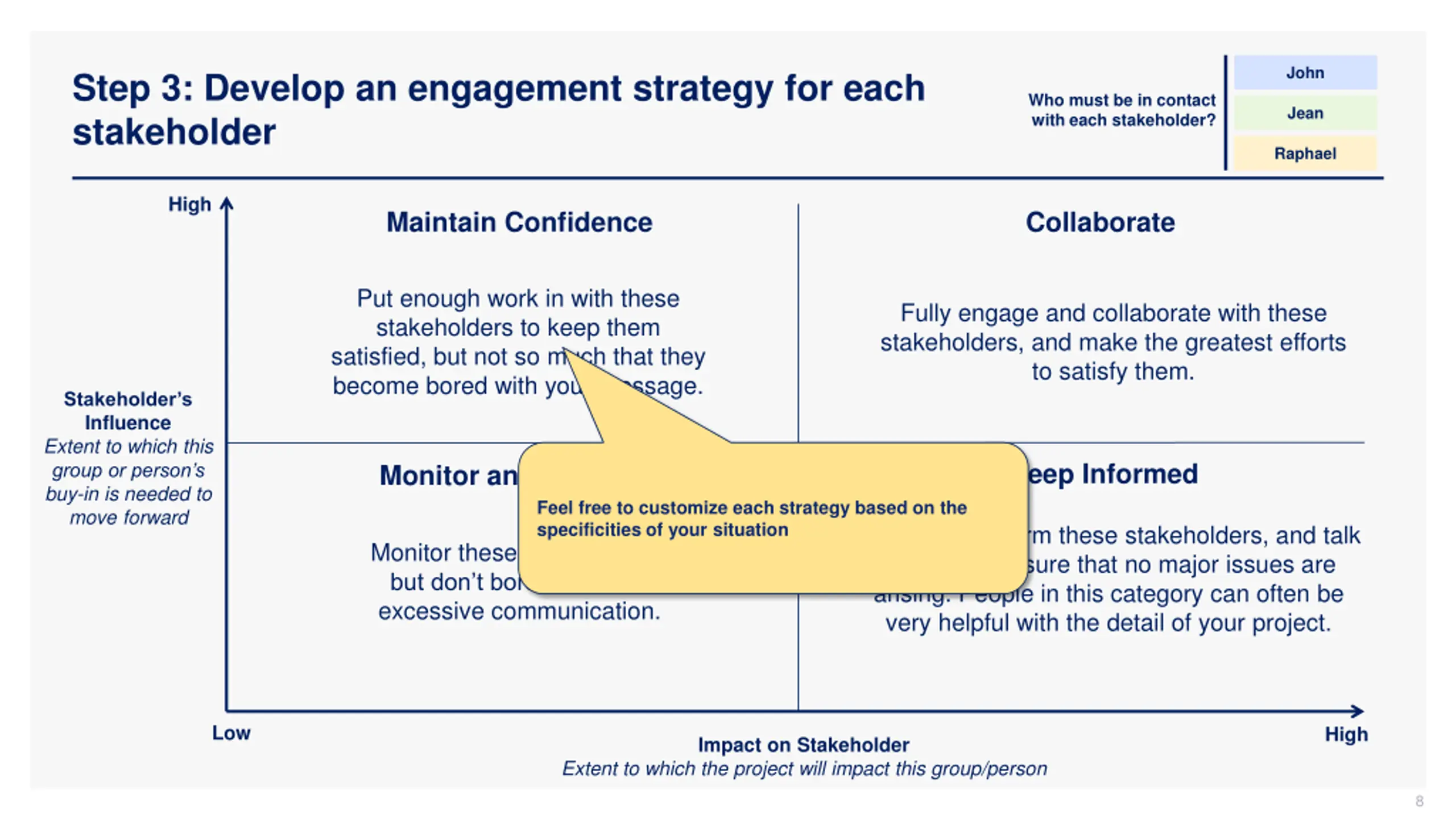 John Step 3: Develop an engagement strategy for each stakeholder Who must be in contact with each stakeholder? Jean Raphael High Maintain Confidence Collaborate Put enough work in with these stakeholders to keep them satisfied, but not so much that they become bored with your message. Fully engage and collaborate with these stakeholders, and make the greatest efforts to satisfy them. Stakeholder s Influence Extent to which this group or person s buy-in is needed to move forward Keep Informed Monitor and Respond Adequately inform these stakeholders, and talk to them to ensure that no major issues are arising. People in this category can often be very helpful with the detail of your project. Monitor these stakeholders, but don t bore them with excessive communication. Low High Impact on Stakeholder Extent to which the project will impact this group/person 7