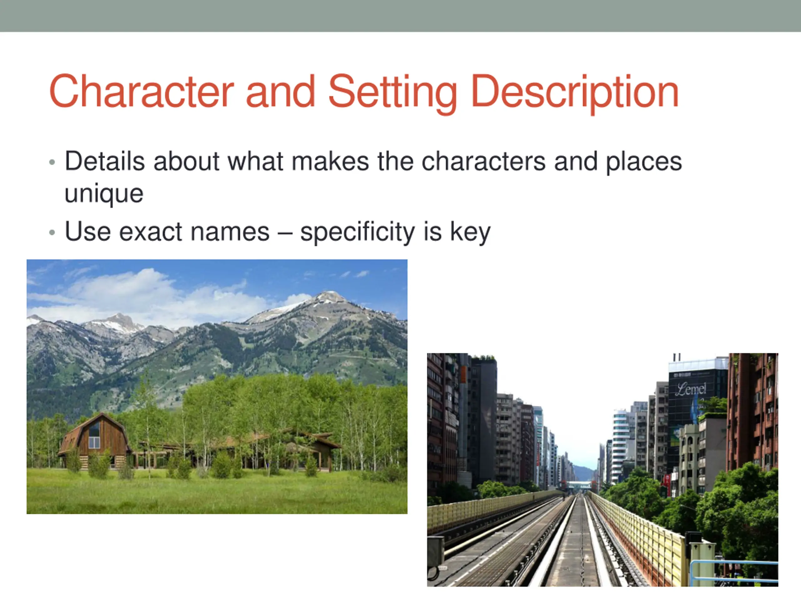 Character and Setting Description Details about what makes the characters and places unique Use exact names specificity is key