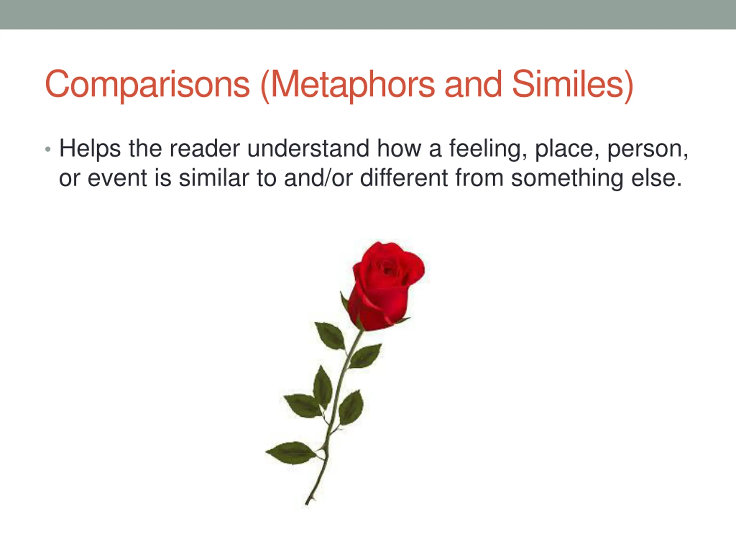 Comparisons (Metaphors and Similes) Helps the reader understand how a feeling, place, person, or event is similar to and/or different from something else.