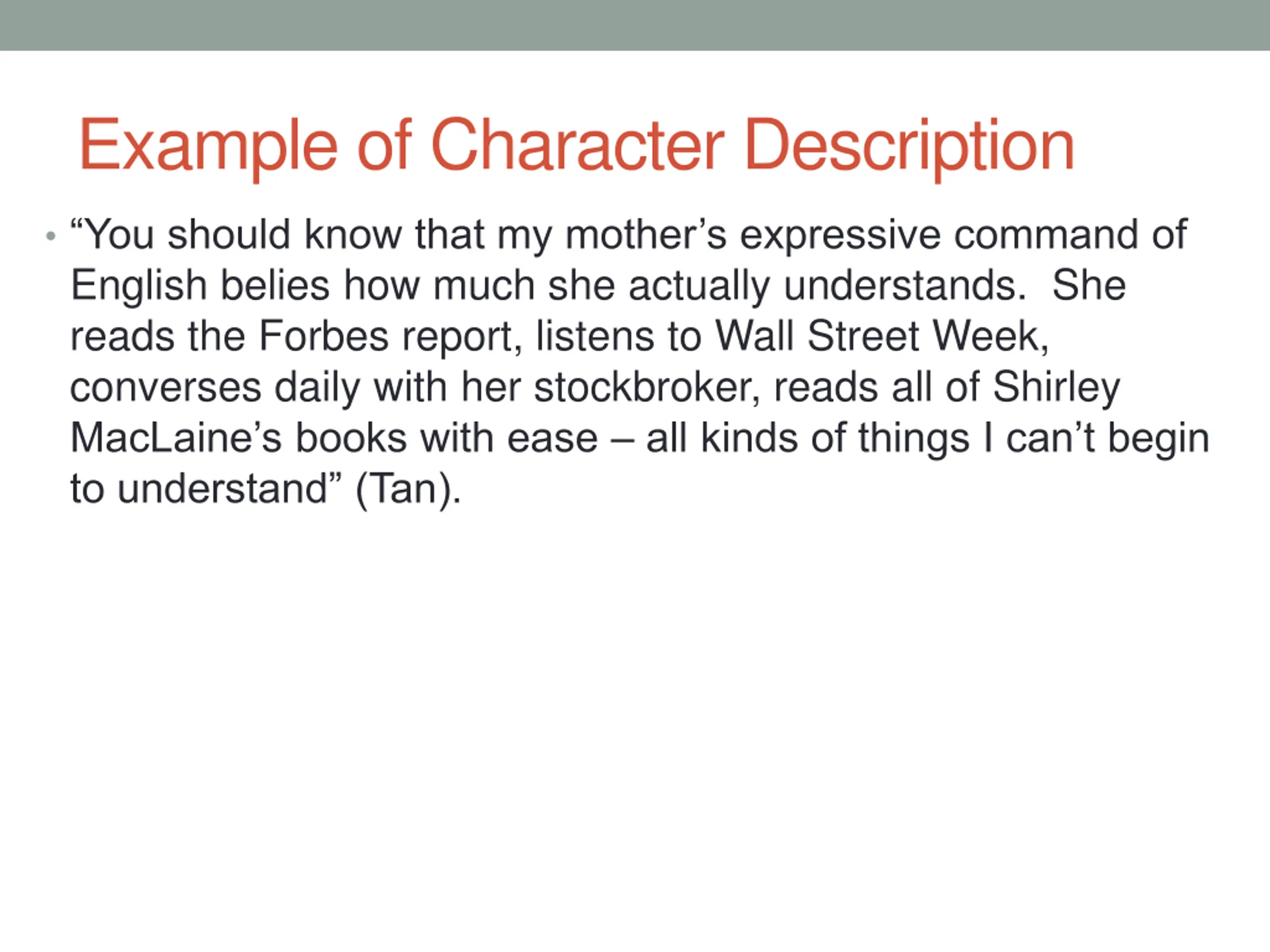Example of Character Description You should know that my mother s expressive command of English belies how much she actually understands. She reads the Forbes report, listens to Wall Street Week, converses daily with her stockbroker, reads all of Shirley MacLaine s books with ease all kinds of things I can t begin to understand (Tan).