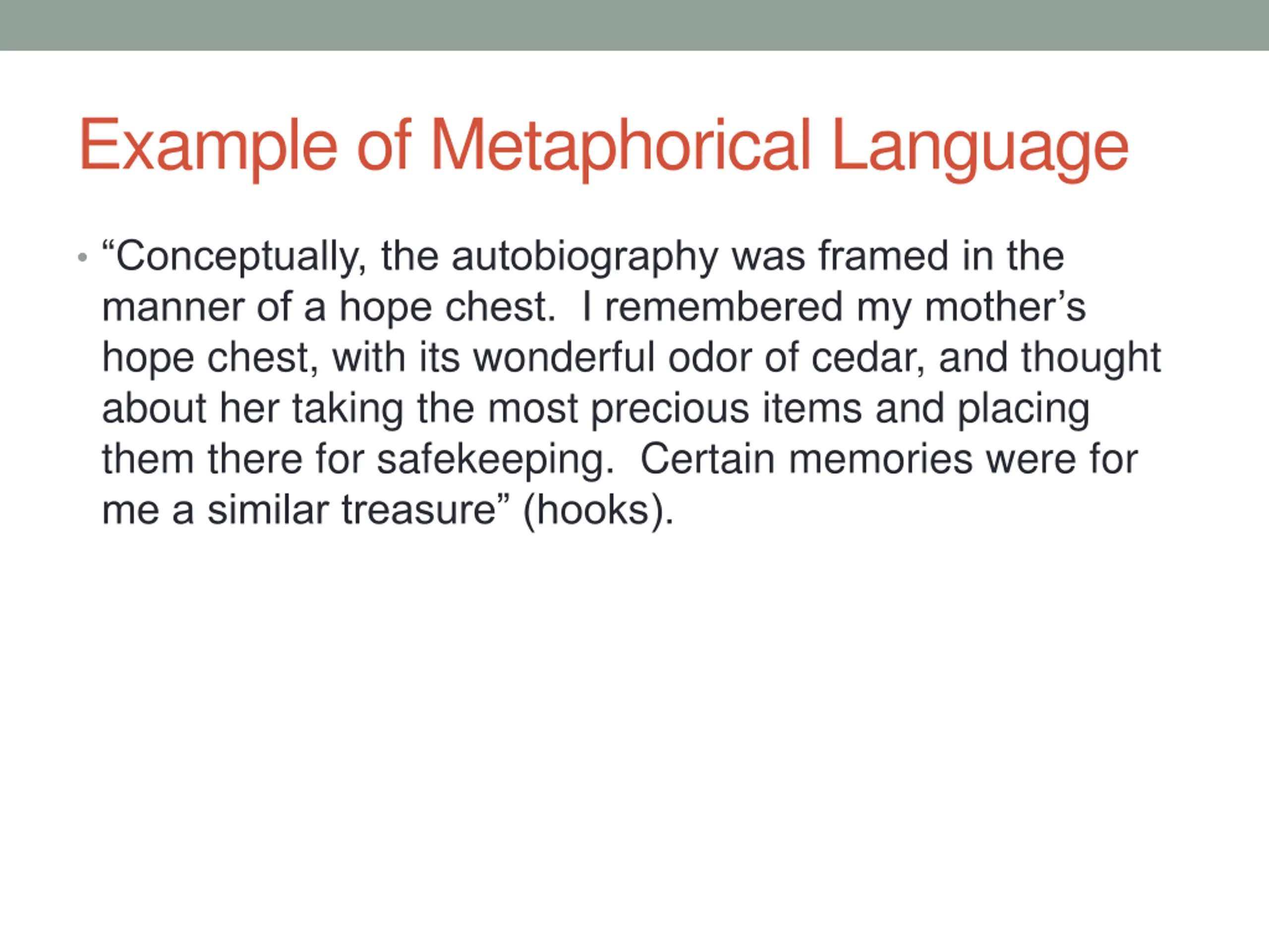 Example of Metaphorical Language Conceptually, the autobiography was framed in the manner of a hope chest. I remembered my mother s hope chest, with its wonderful odor of cedar, and thought about her taking the most precious items and placing them there for safekeeping. Certain memories were for me a similar treasure (hooks).