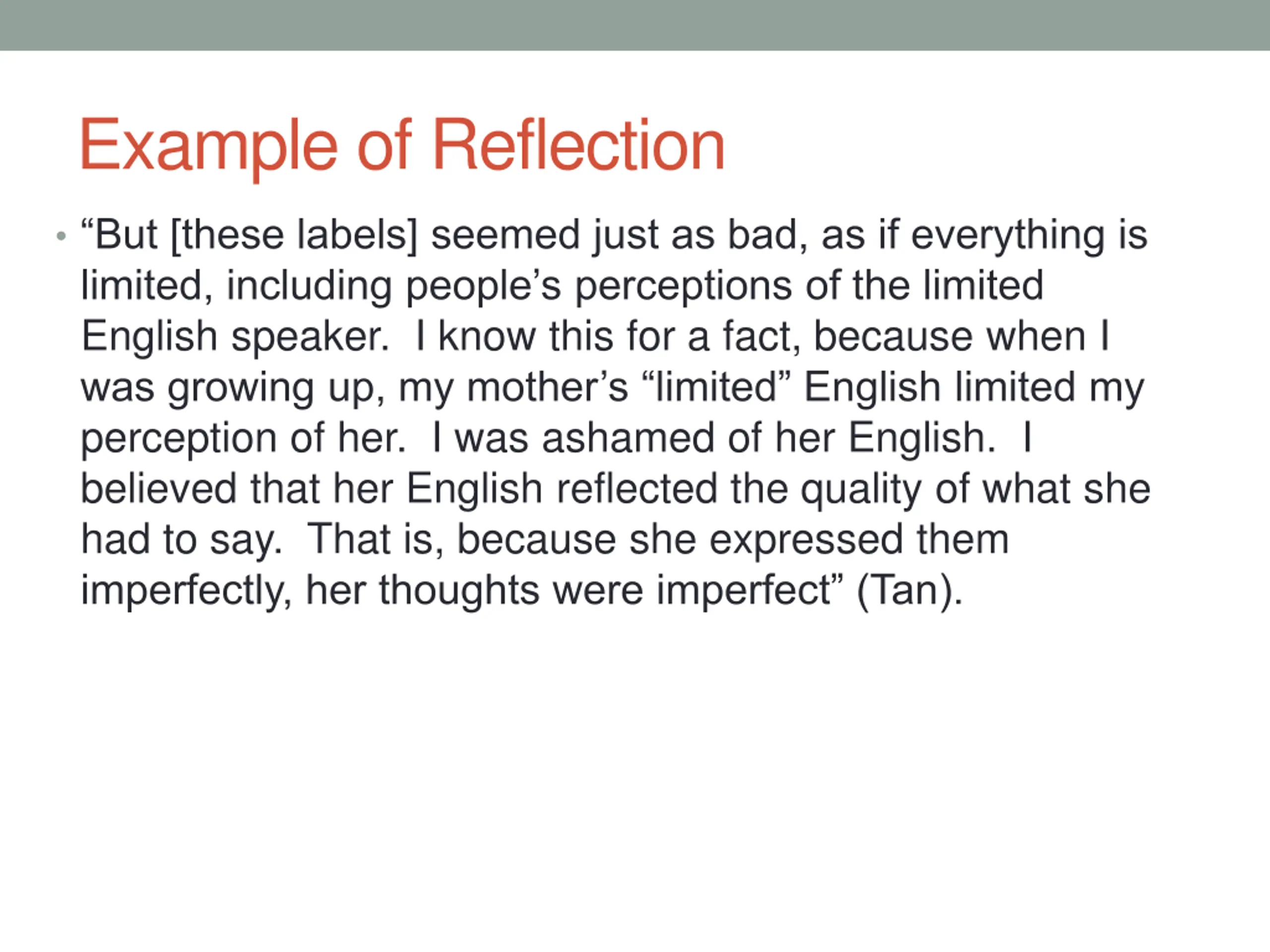 Example of Reflection But [these labels] seemed just as bad, as if everything is limited, including people s perceptions of the limited English speaker. I know this for a fact, because when I was growing up, my mother s limited English limited my perception of her. I was ashamed of her English. I believed that her English reflected the quality of what she had to say. That is, because she expressed them imperfectly, her thoughts were imperfect (Tan).