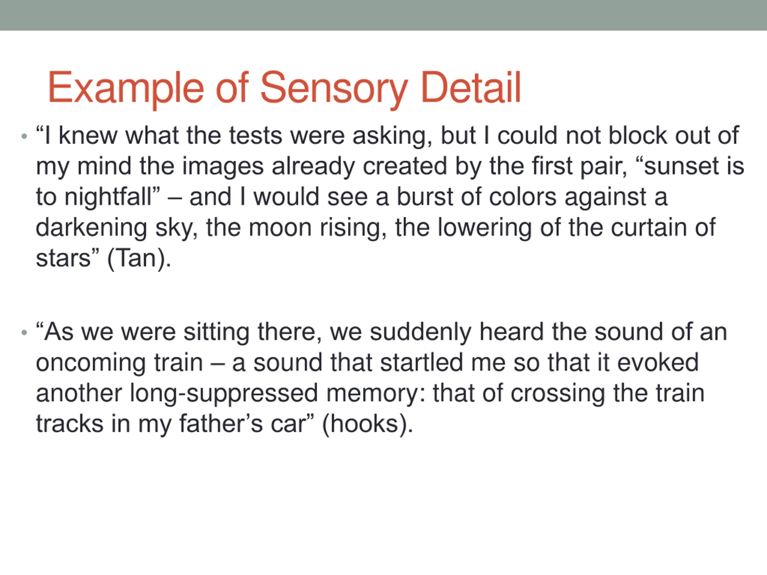 Example of Sensory Detail I knew what the tests were asking, but I could not block out of my mind the images already created by the first pair, sunset is to nightfall and I would see a burst of colors against a darkening sky, the moon rising, the lowering of the curtain of stars (Tan). As we were sitting there, we suddenly heard the sound of an oncoming train a sound that startled me so that it evoked another long-suppressed memory: that of crossing the train tracks in my father s car (hooks).