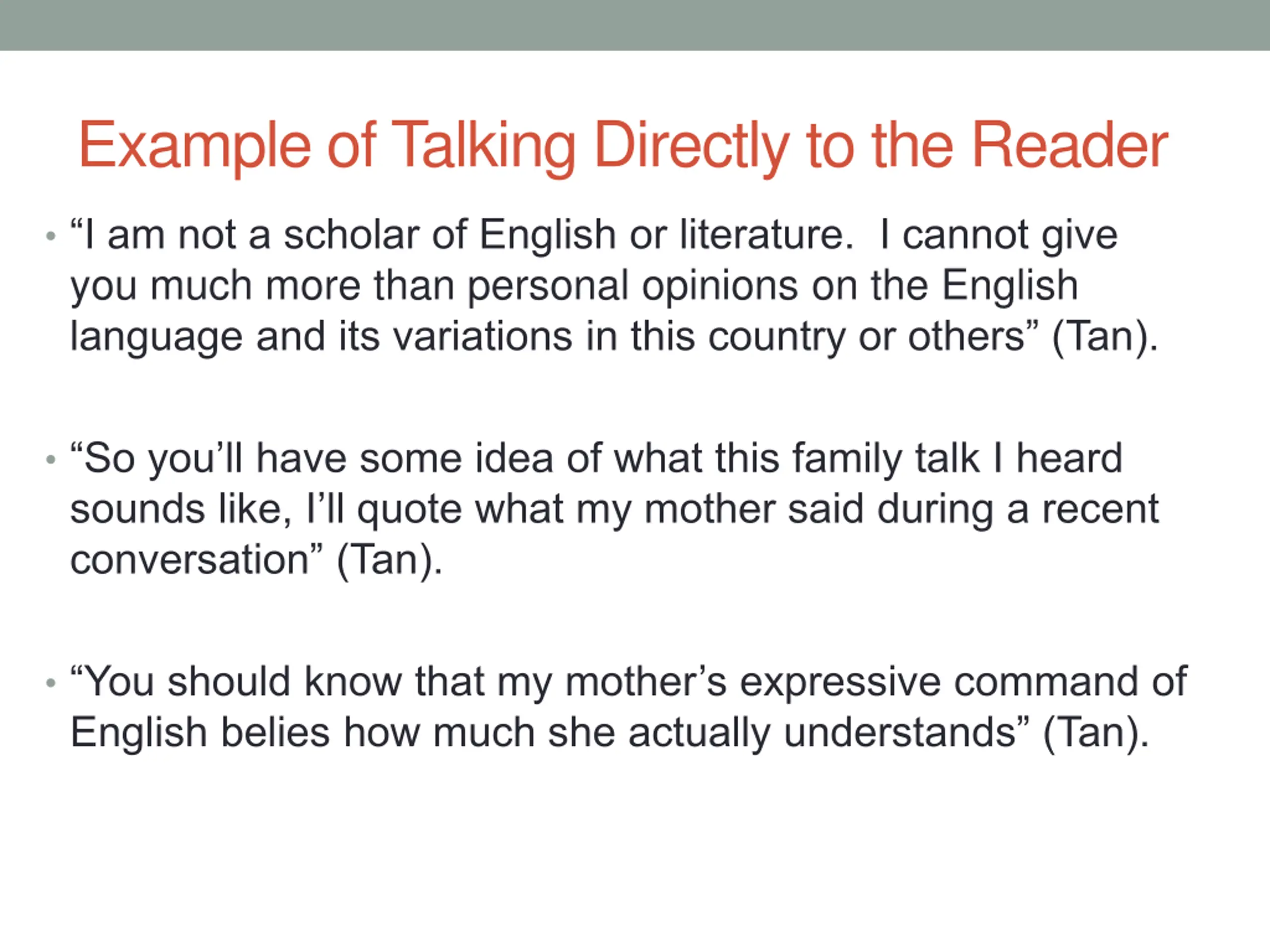 Example of Talking Directly to the Reader I am not a scholar of English or literature. I cannot give you much more than personal opinions on the English language and its variations in this country or others (Tan). So you ll have some idea of what this family talk I heard sounds like, I ll quote what my mother said during a recent conversation (Tan). You should know that my mother s expressive command of English belies how much she actually understands (Tan).