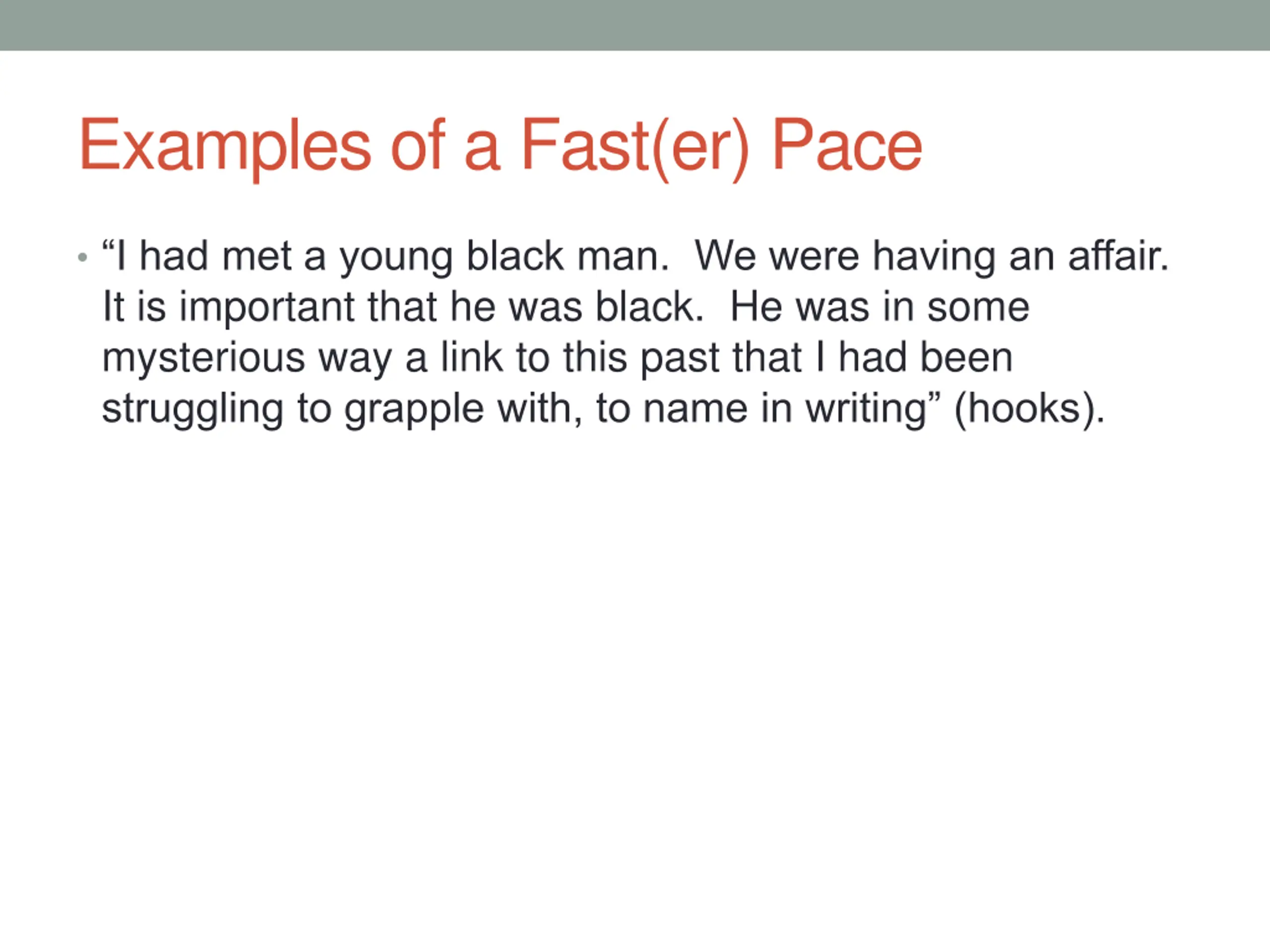 Examples of a Fast(er) Pace I had met a young black man. We were having an affair. It is important that he was black. He was in some mysterious way a link to this past that I had been struggling to grapple with, to name in writing (hooks).